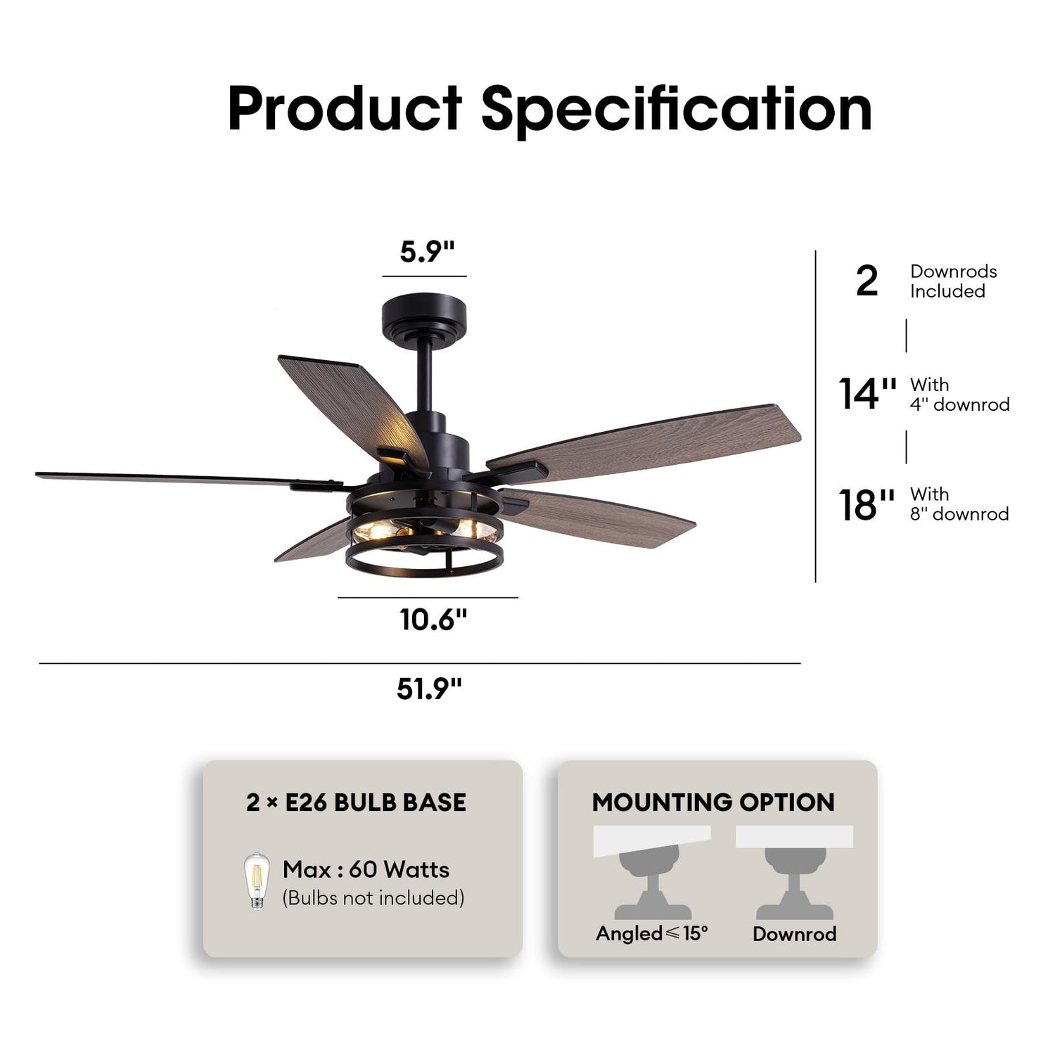 52 Inch Ceiling Fans with Lights and Remote Control, Farmhouse Ceiling Fan for Bedroom Living Room and Patio, Black Caged Ceiling Fan for Indoor and Outdoor