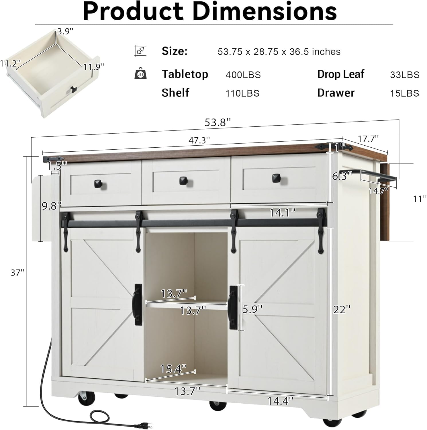 - [Timeless Farmhouse Elegance] This Large kitchen island measures 53.75''W x 28.75''D x 36.5'' H. It is designed in a beautiful and elegant farmhouse style, adding a cozy natural vibes to your space. Its warm distressed white cabinets, brown wood grain tabletops and lend a touch of farmhouse charm. Additionally, the metal trim and classic Sliding barn door elements add a retro accent, making this kitchen cabinet fancier and allowing it to perfectly blend into your kitchen and dining room.