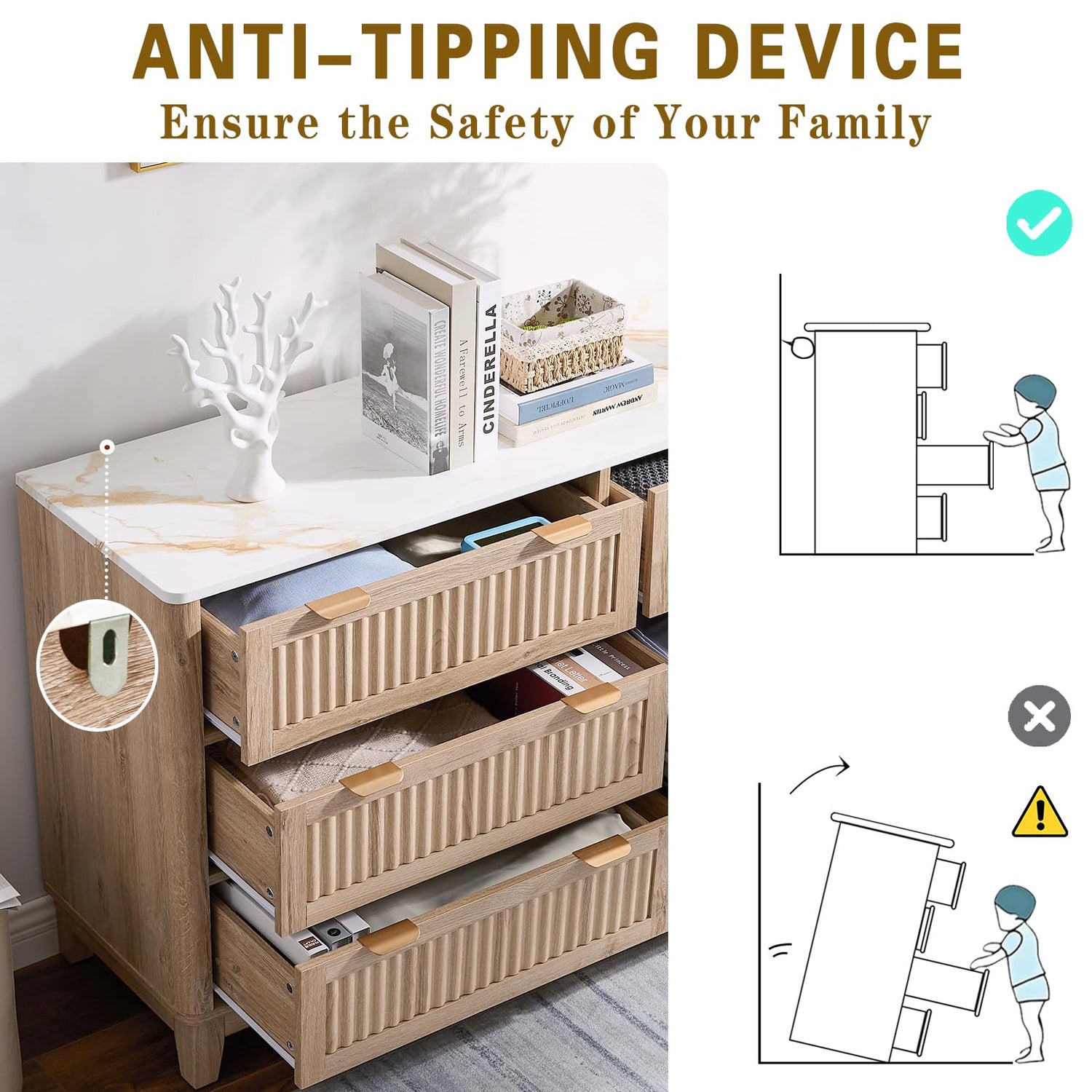 - Distinctive Tabletop Design: The fluted dresser for bedroom is topped with faux marble look and fronted with waveform panel, both using blister molding tech and premium PVC veneer, adding a touch of elegance and luxury. The boho dresser surface has a tint of yellowish veined marble and is waterproof, easy to clean with either a wet cloth or a dry cloth.
