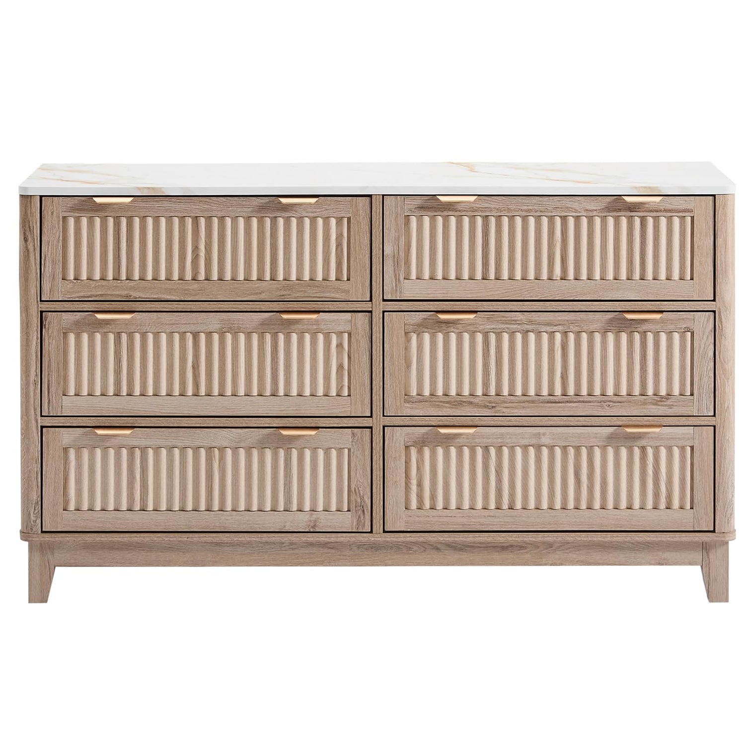 6 Drawers Dresser for Bedroom, 54" Large Storage Dresser, Farmhouse Wood Dressers with Faux Marble Top, Modern Dressers & Chests of Drawers for Living Room Entryway, Fluted Curved Profile, Natural Oak
