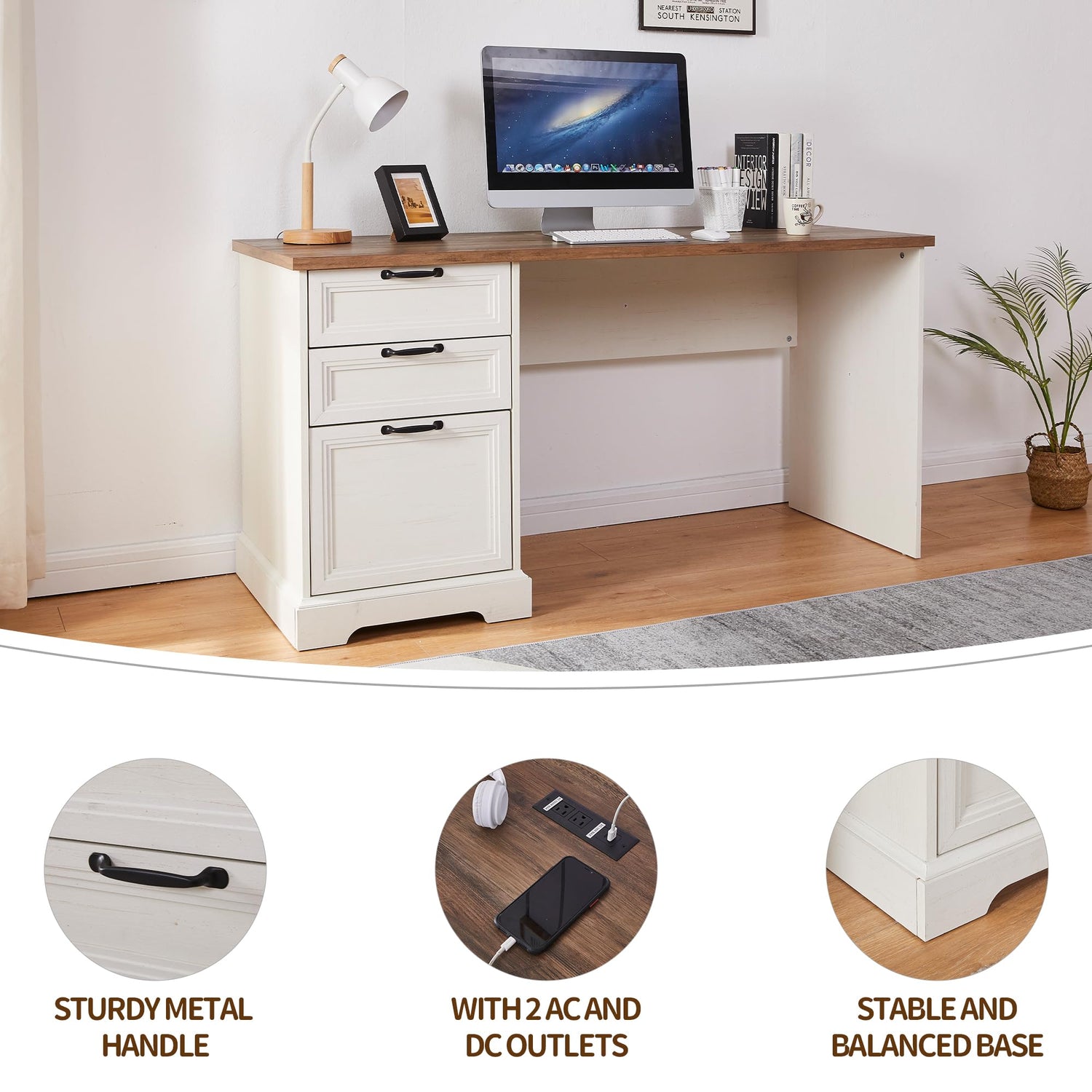 60"L-Shaped Executive Desk with 40"Adjustable File Cabinet,Farmhouse Home Office Desk with Charging Station,Office Desk with Storage Drawers,Wood Computer Desk Set for Office Work,Home Study