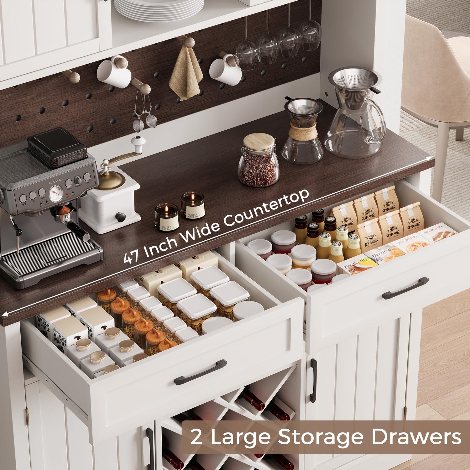 - 47‘’ WIDE COUNTERTOP WITH CHARGING STATION: With a 47.3-inch wide countertop, this coffee bar offers ample space for your essentials. Equipped with two AC outlets and two USB ports, it easily supports appliances like coffee makers, microwaves, and toasters. Say goodbye to outlet shortages and enjoy the convenience