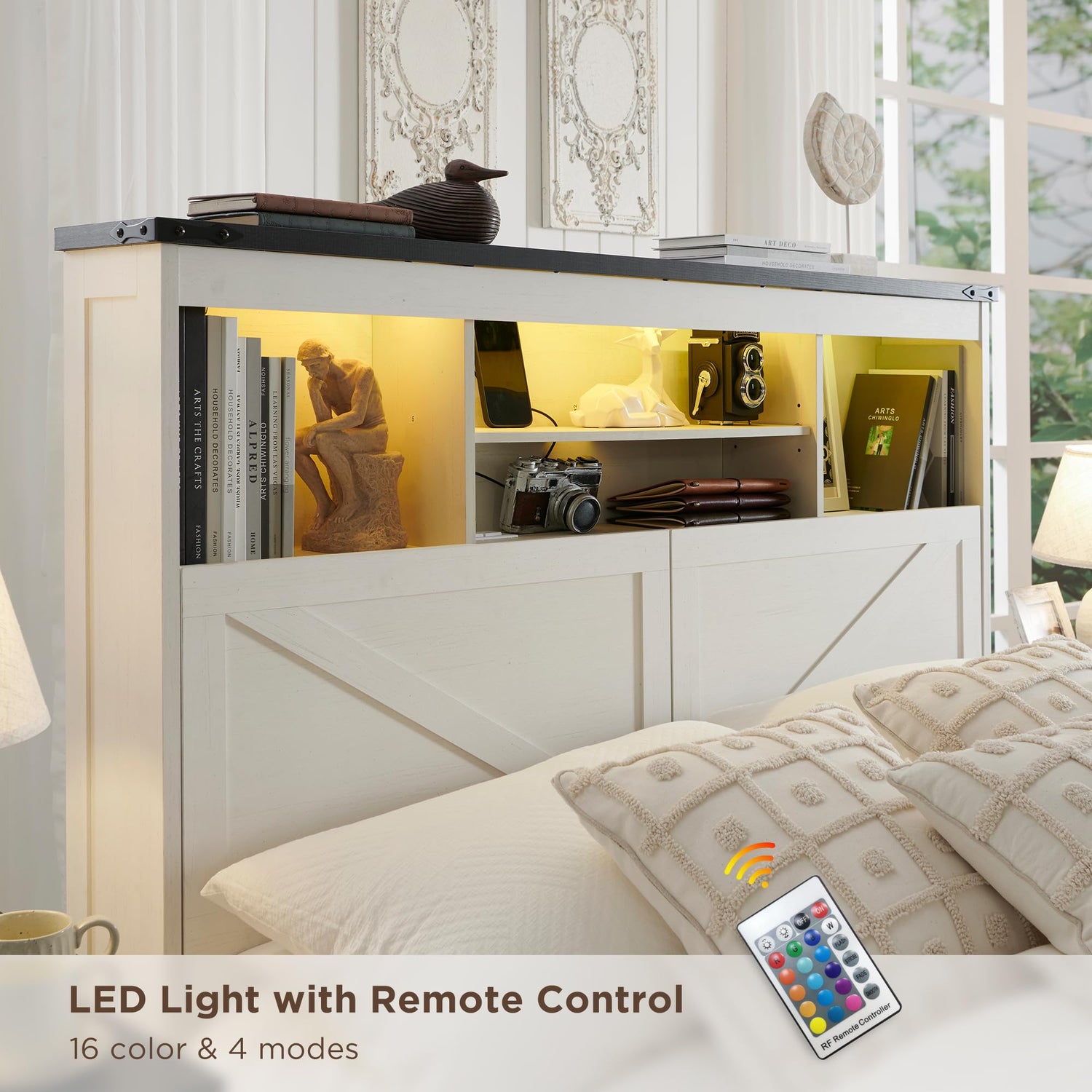 ACCOHOHO Farmhouse Full Size Wood Bed Frame with 52" Tall Storage Headboard and 4 Drawers,LED Light,Charging Station,Solid Wood Slats Support,Noiseless,No Box Spring Needed,Antique White