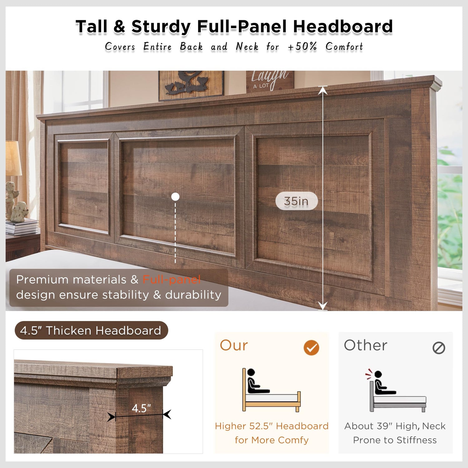 - 52" Deluxe Full-Panel Tall Headboard: Specifically engineered for optimal comfort, this rustic wood queen-size bed frame features a towering 52.5" tall headboard, providing luxurious backrest support for reading or play your phone, alleviating neck stiffness and back muscle tension. Constructed with premium engineered wood and a full-panel design, it ensures unparalleled strength and stability compared to delicate jointed headboards.