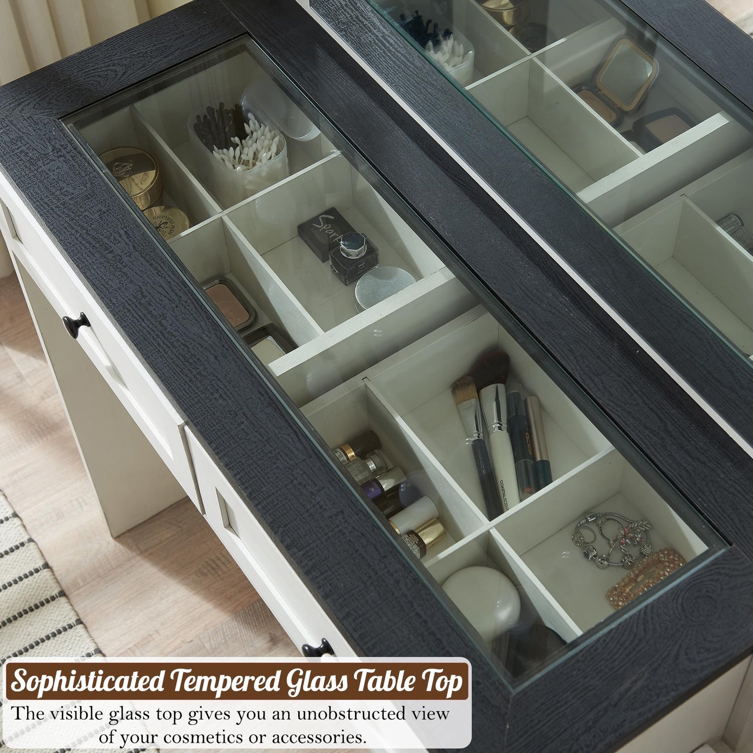 - 【Charging Station & Glass Tabletop】Vanity set includes an cushioned stool for added comfort and a built-in charging station featuring 2 AC outlets & 2 USB ports for easy device charging. Also, transparent tempered glass tabletop allows easy access to your belongings while doing makeup