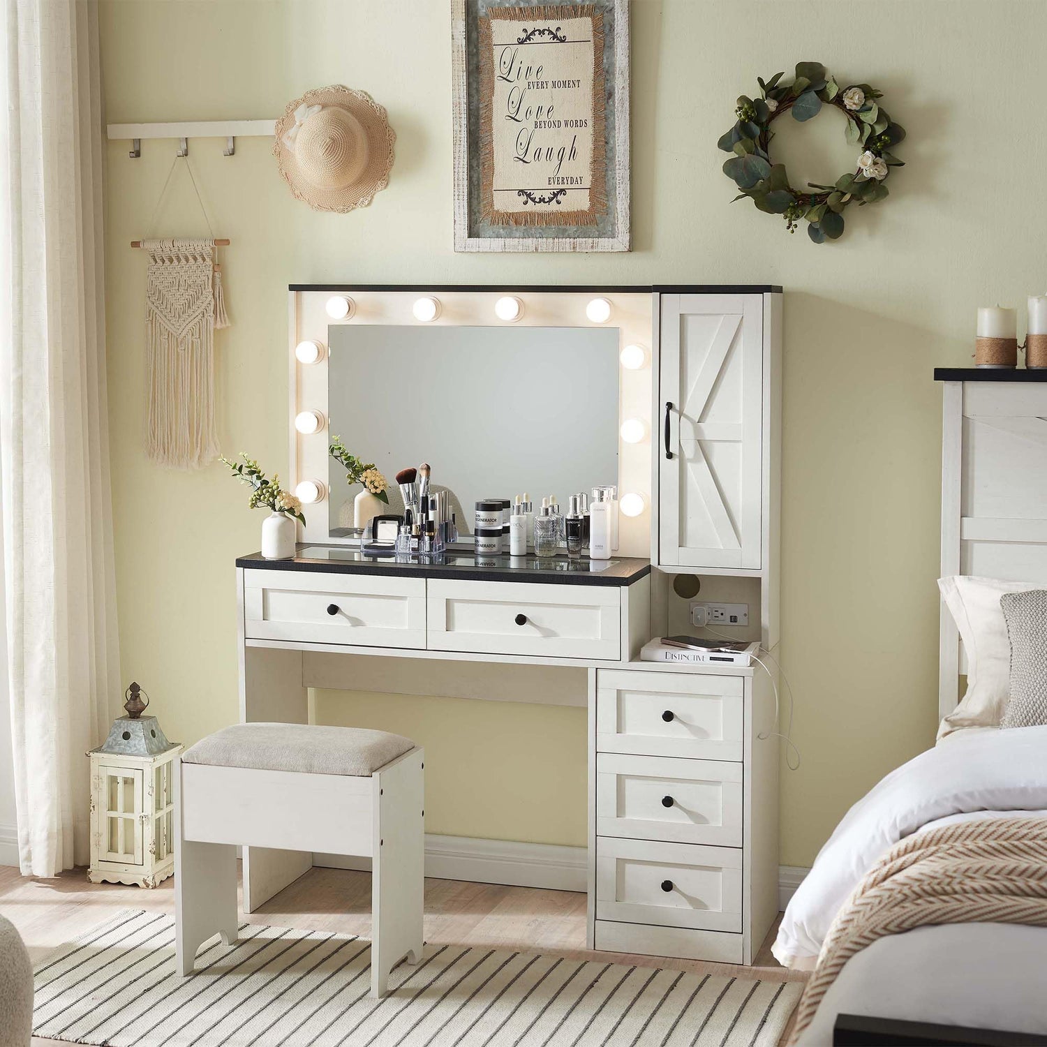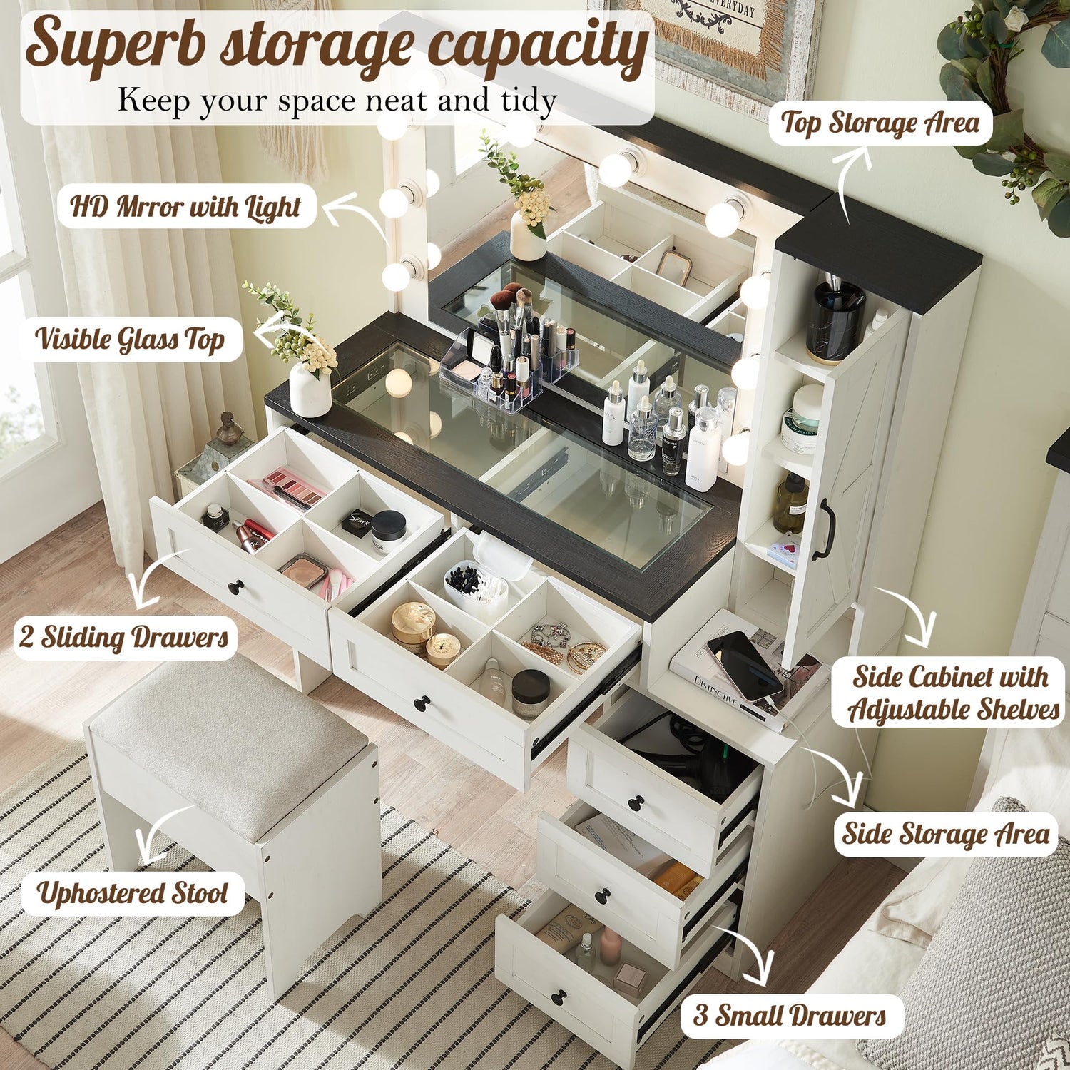 ACCOHOHO Farmhouse Vanity Desk with Mirror and Lights, 43" Wide Makeup Vanity with Glass Tabletop and Charging Station, Modern Vanity Table Set with Storage and Stool for Bedroom, Off White