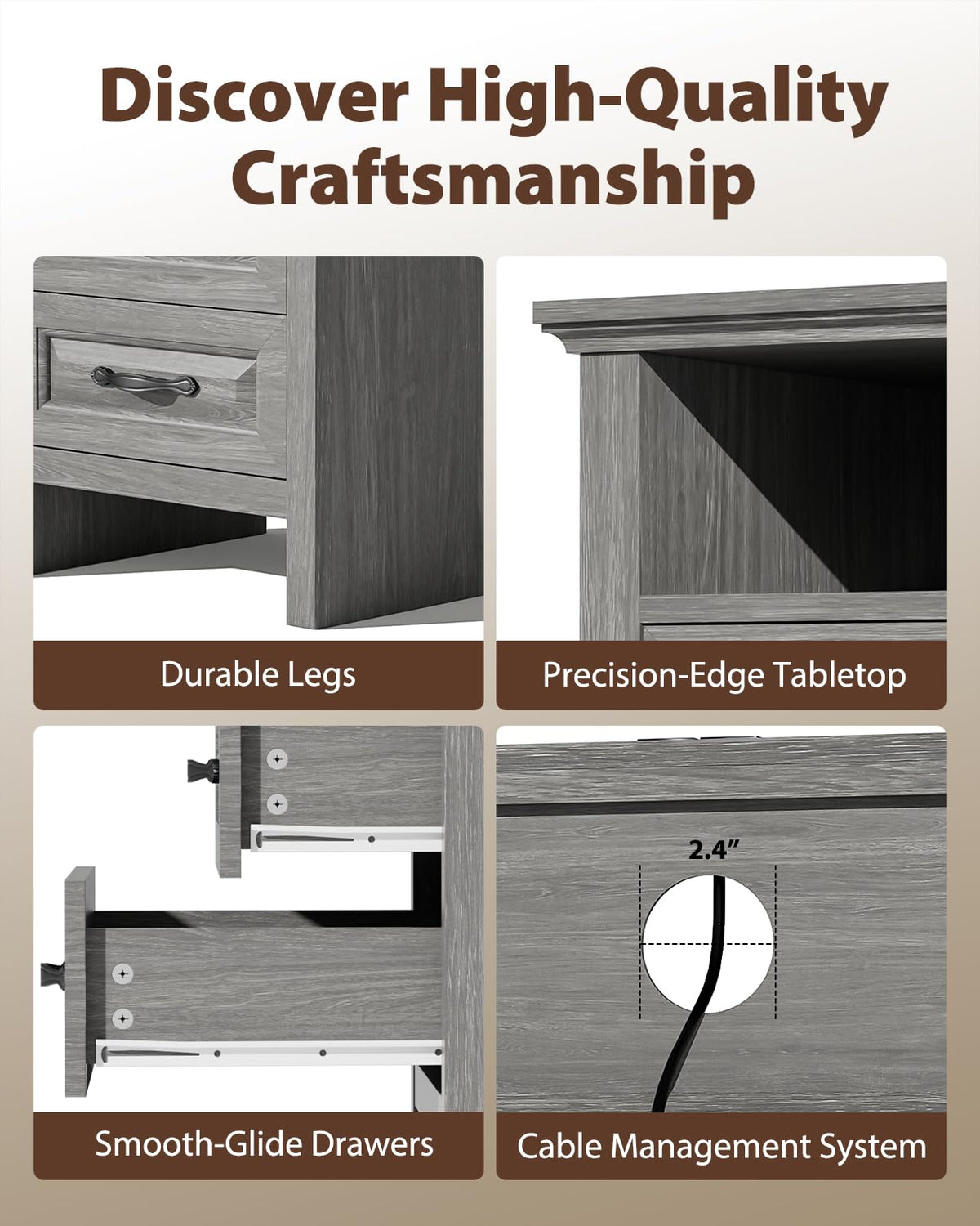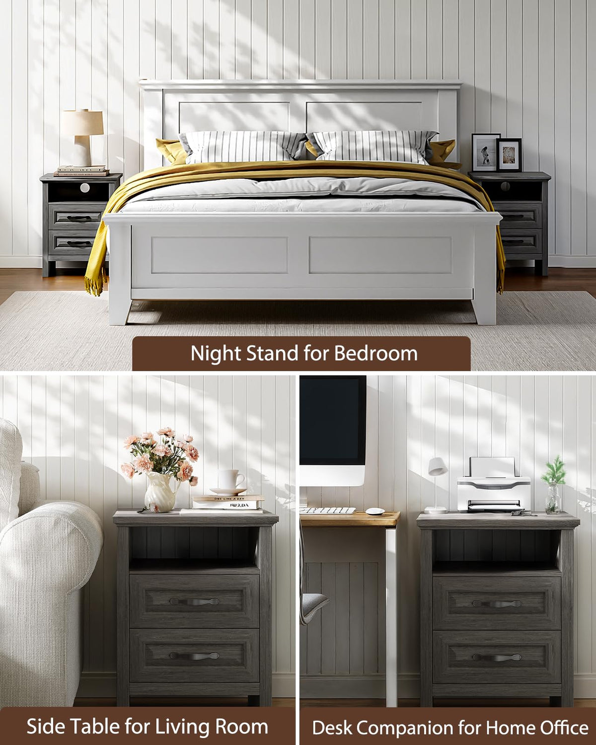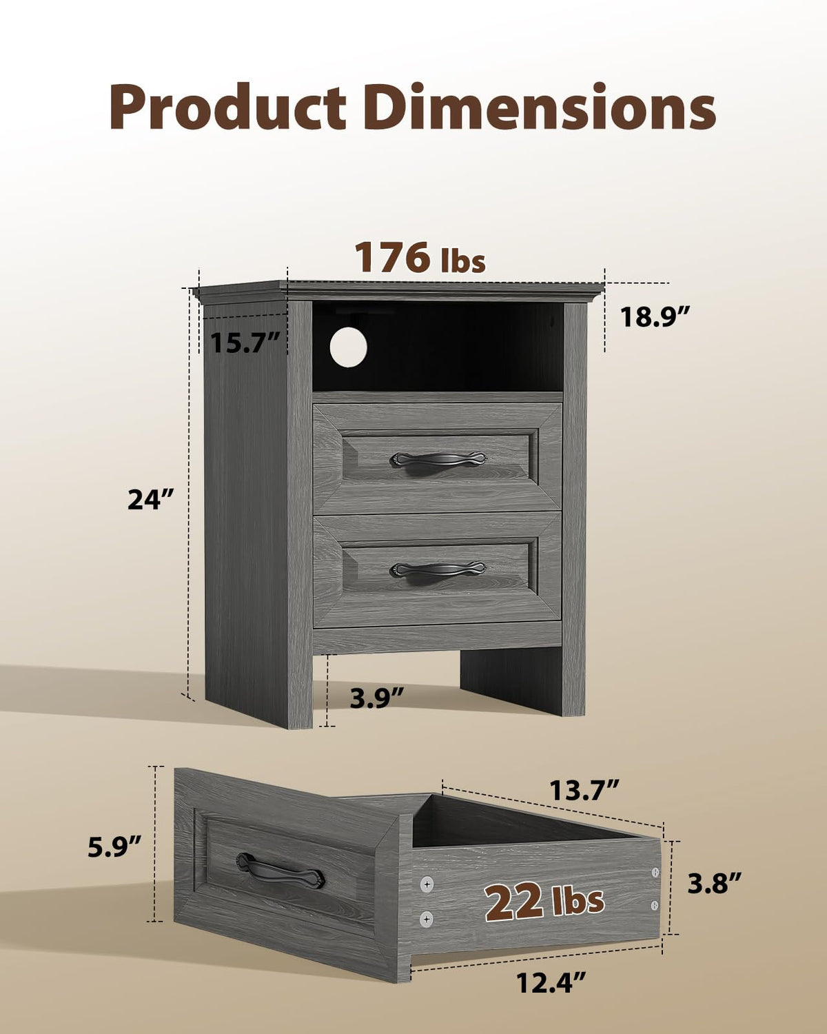 Amada Farmhouse Nightstand with Charging Station, 18.9 Inch Wide Bedside Table with 2 Drawers, USB A Port, USB C Port, 2 AC Outlets, Rustic Farmhouse End Table for Bedroom, Gray