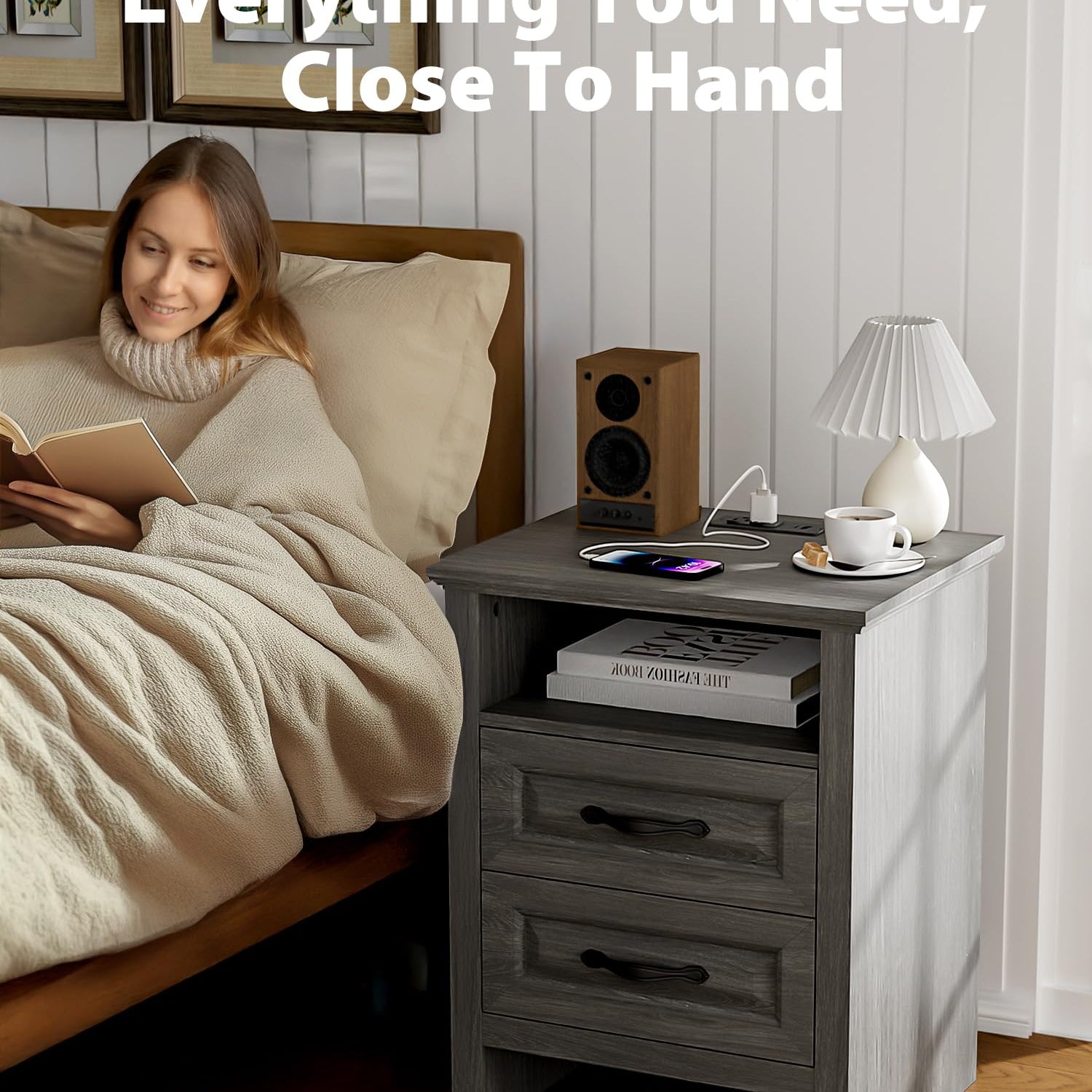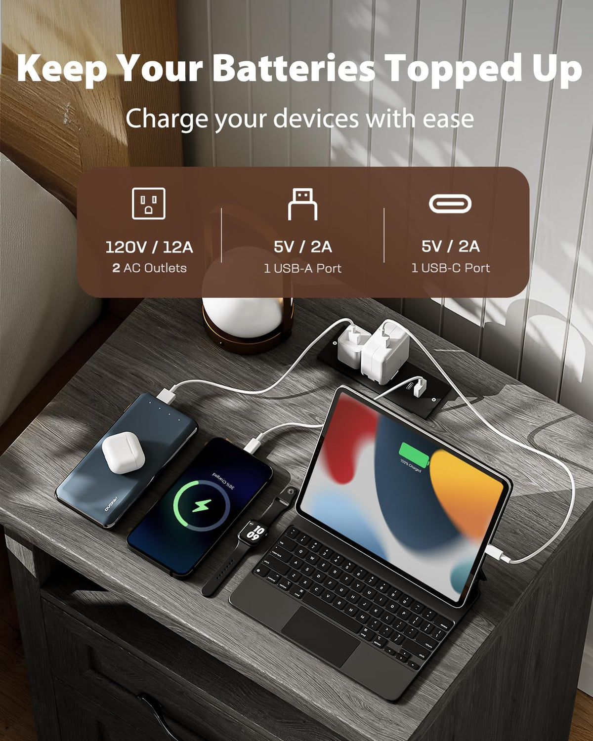 - 【Built-in Charging Station】More than just a nightstand — equipped with 2 AC outlets, 1 USB-A, and 1 Type-C port, this bedside table keeps your phone, tablet, and other essentials powered up. The built-in charging station is cleverly hidden in the open shelf to reduce clutter and keep your space clean and modern.
