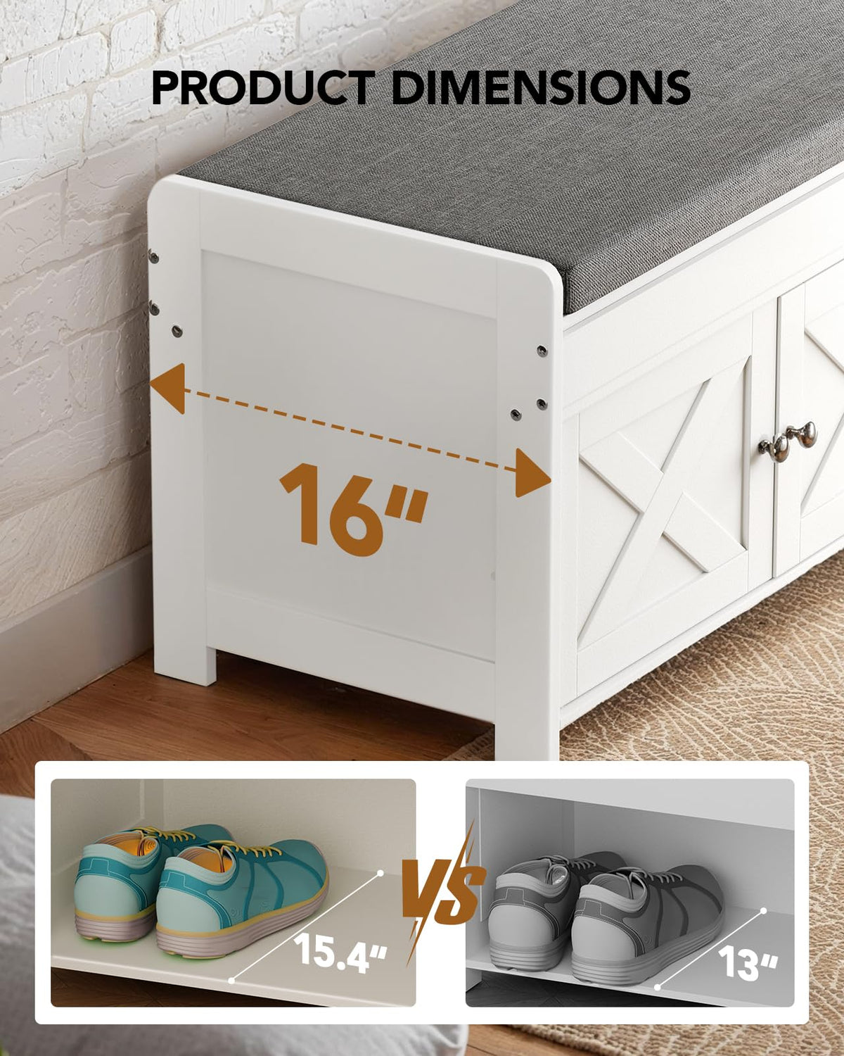 - 【Tailored Storage Bench That Fits Your Needs】Upgrade your entryway with this 16"-deep rustic shoe rack bench featuring three cabinet doors and two adjustable shelves (three height settings) for customizable storage. The extra-deep design effortlessly accommodates bulky boots, baskets, and men's size 13+ shoes, while the top-lid storage seat reveals hidden storage for blankets or seasonal items, with full-door coverage keeping all contents completely dust-free. – its compact 43.4"W x 18.1"H frame fits snugly in small spaces. Perfect for keeping shoes, accessories, and clutter neatly organized behind closed doors while adding rustic warmth to your home