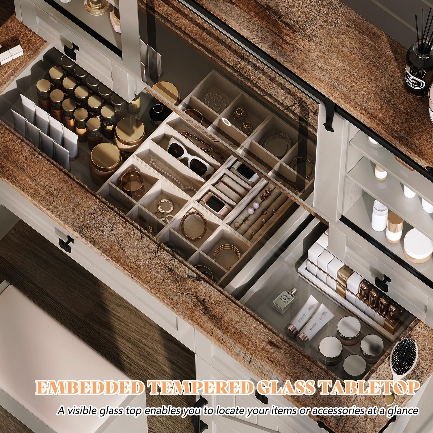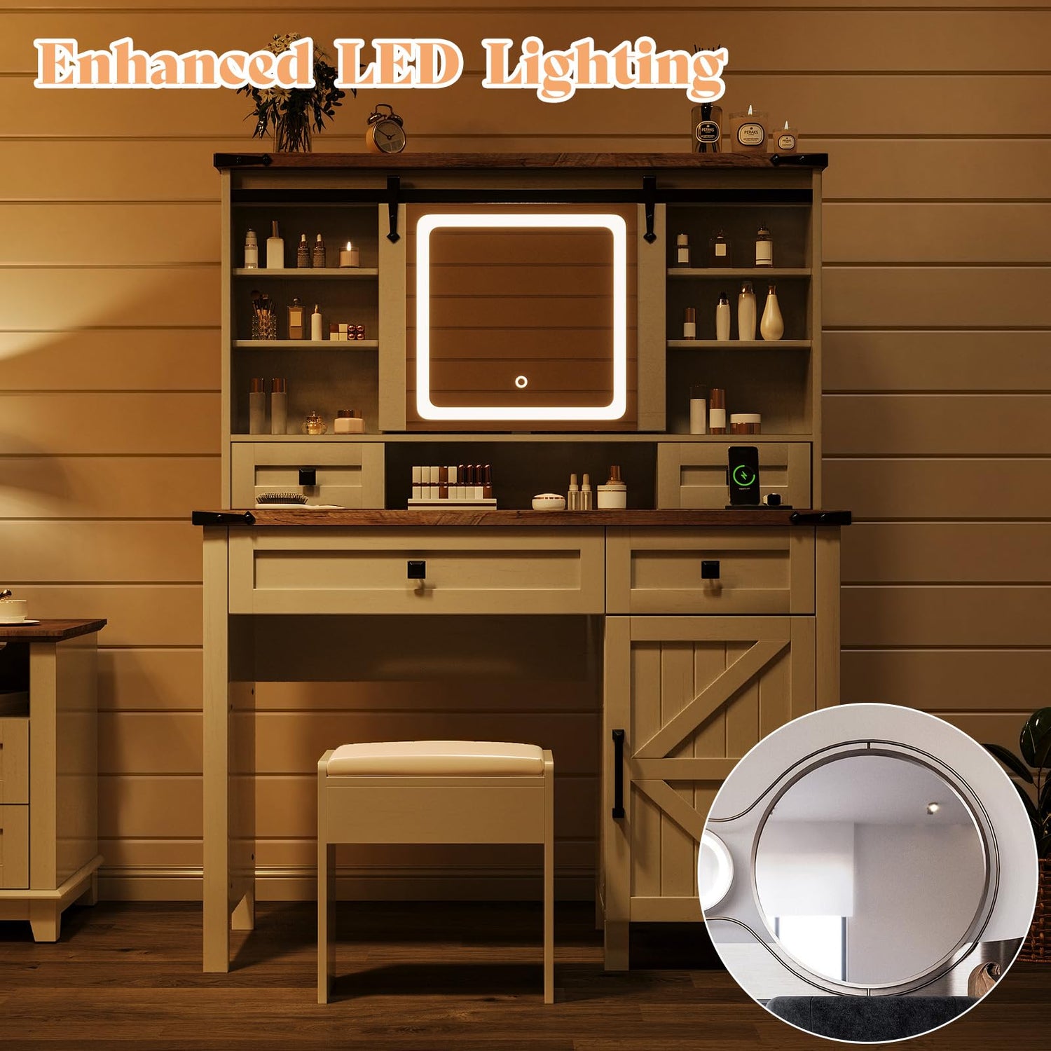- Chic Farmhouse Vanity Desk: Glam glass top, distressed wood finish, and barn door details add rustic charm, while the sliding lighted mirror enhances elegance in your bedroom(not include the bench)