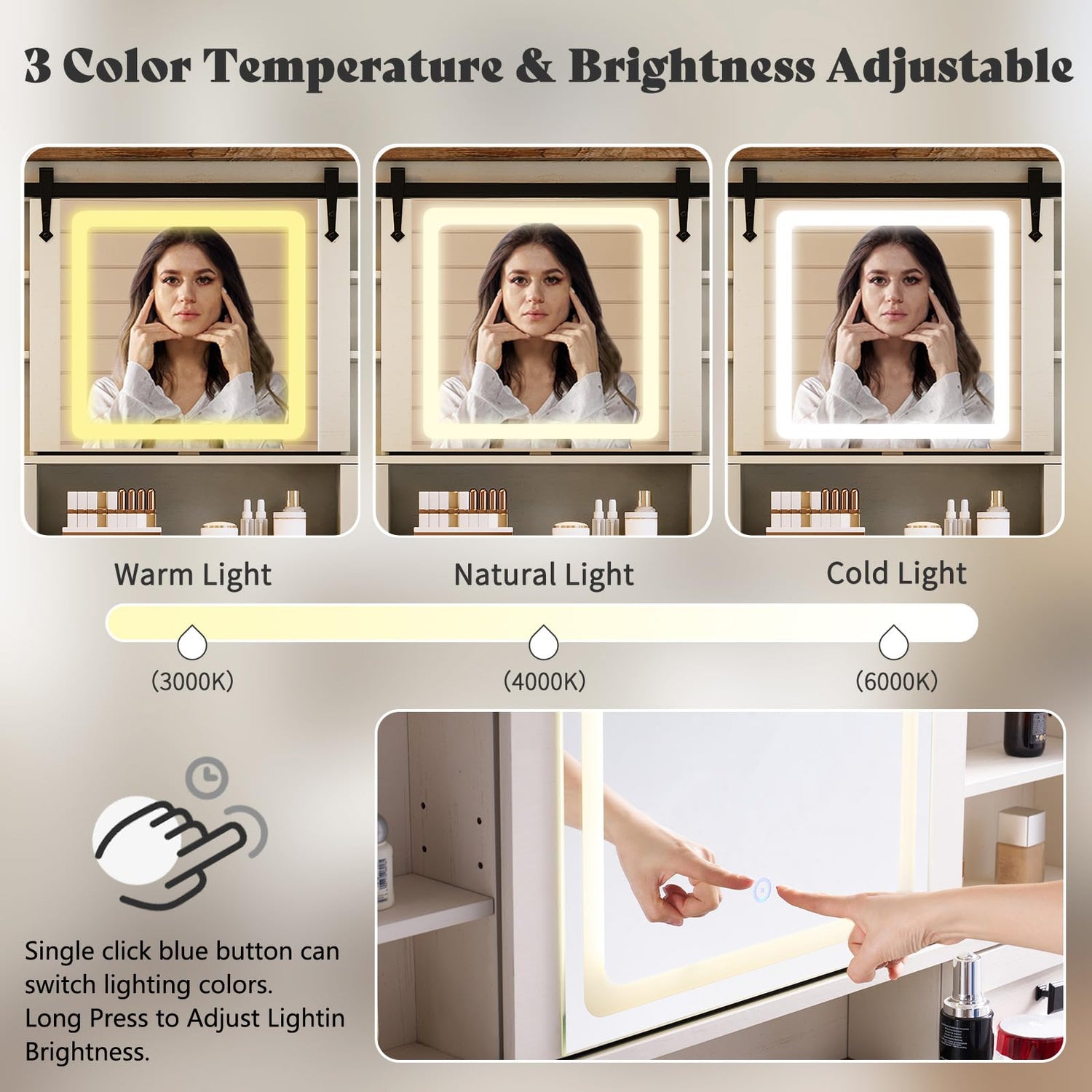 - Sliding Touch Control Lighted Mirror: Slide the mirror to either side and use the touch control to adjust between 3 color modes, making your daily beauty routine effortless and enjoyable