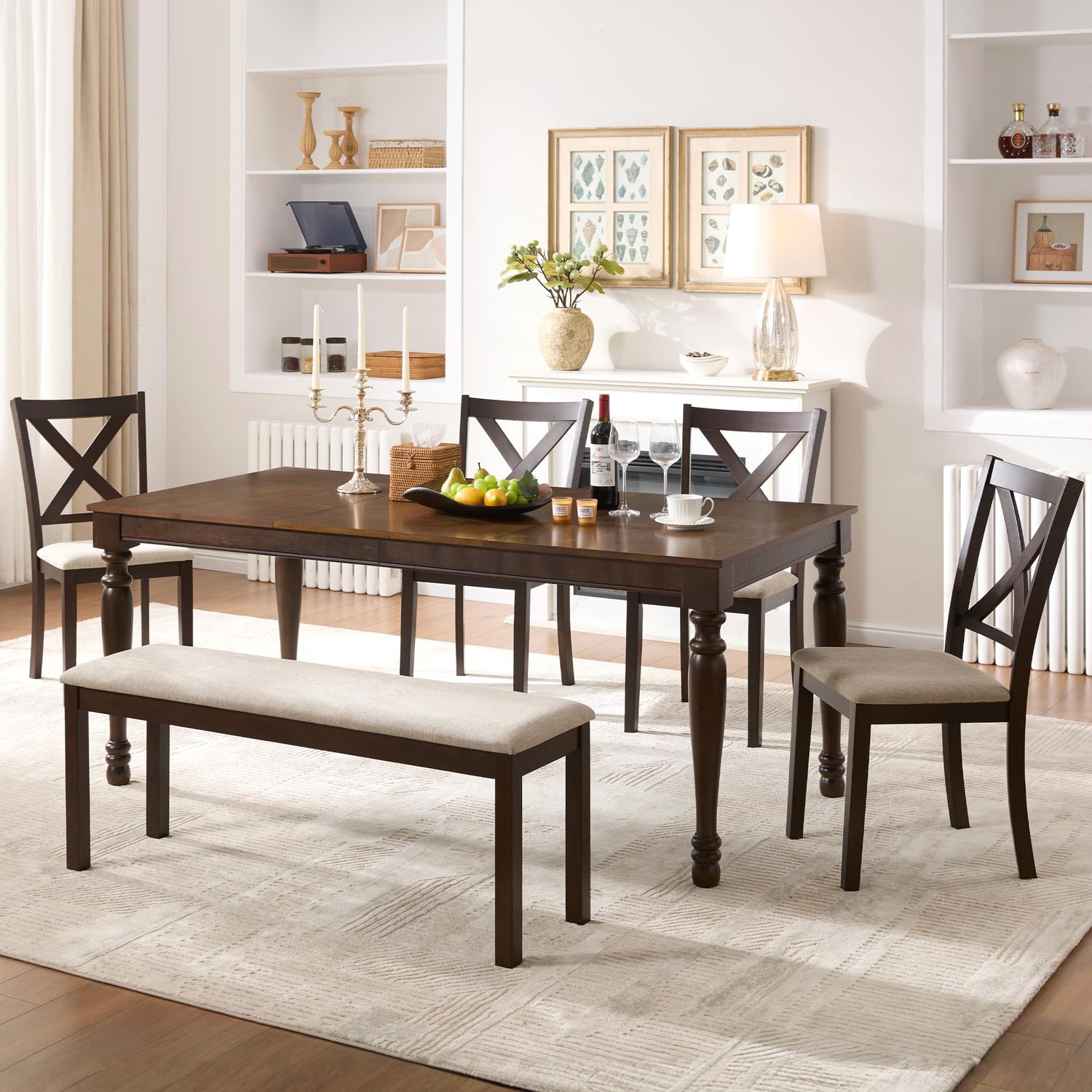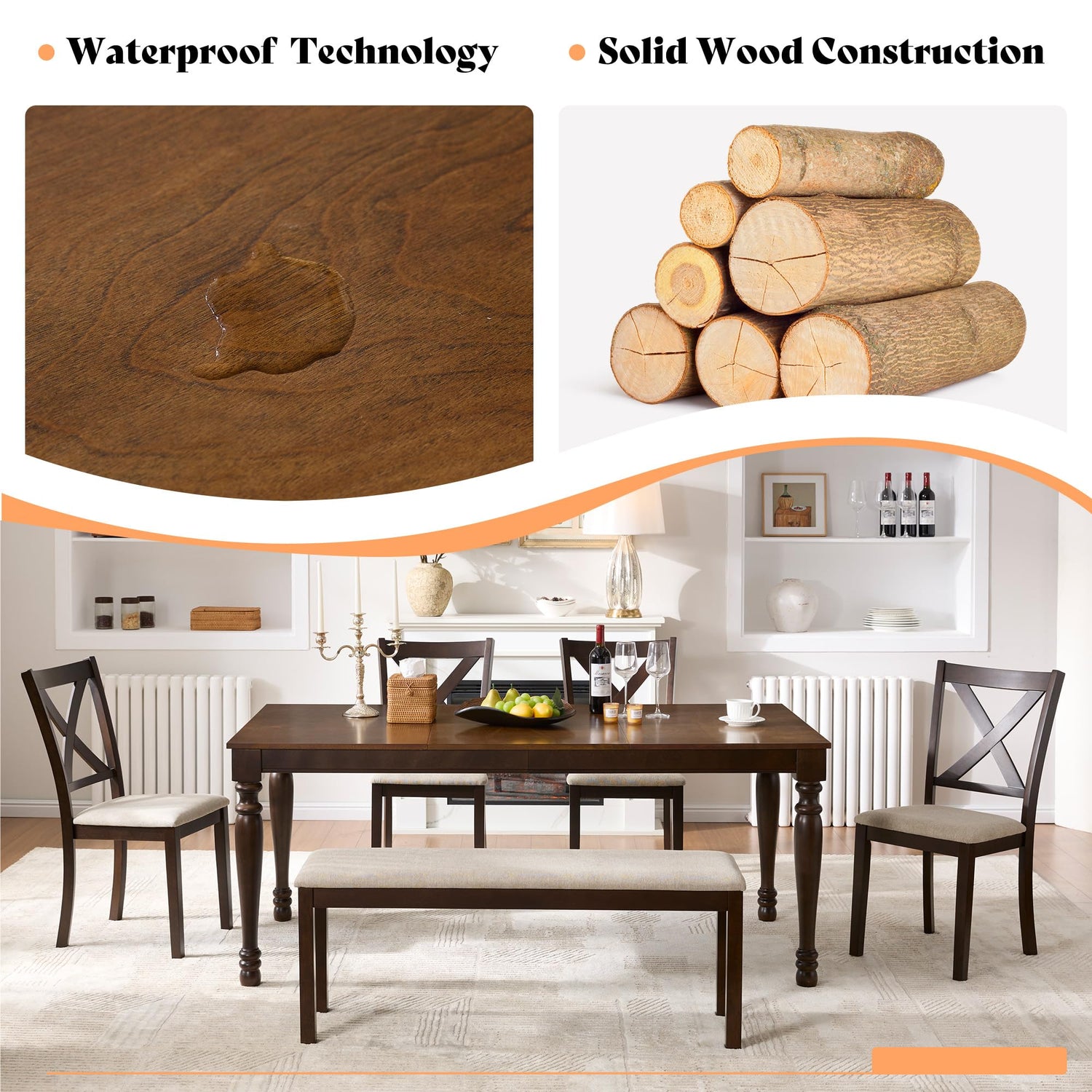 AMERLIFE 6 Piece Farmhouse Dining Table Set, 71'' Solid Wood Table with Upholstered Chairs & Bench, Seating for 6, for Kitchen or Dining Room, Brown & Black