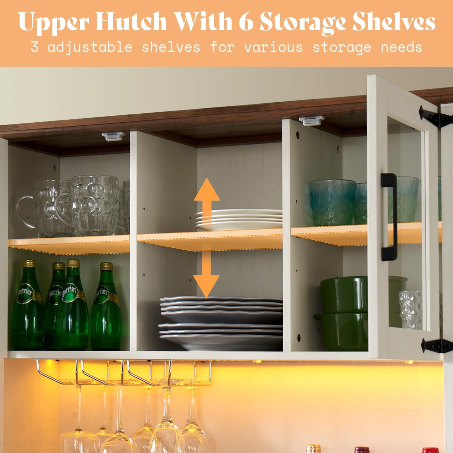 - Coffee Bar: The farmhous bar with smooth sliding barn door combines retro and classic. Enhance your home with 3 wine glass holders, allowing for the elegant display of up to 6 red wine glasses. Each cabinet features adjustable shelves, providing a customizable and versatile storage solution tailored to your needs.