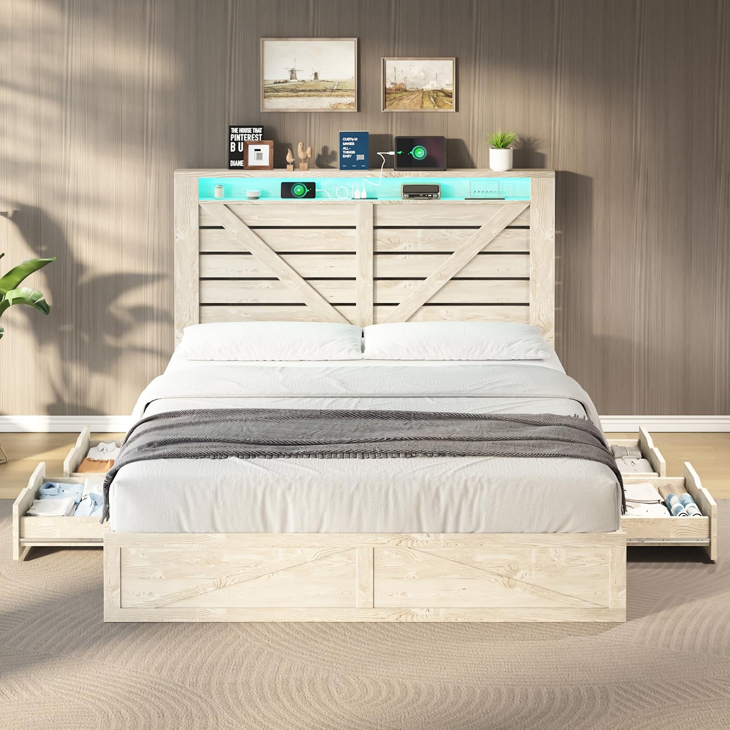 AMERLIFE Farmhouse Bed Frame with 4 Drawers & 4 Open Storage Space, Queen Size Storage Bed with LED Light & Charging Station, Wooden Slats, Noise Free, Rustic White