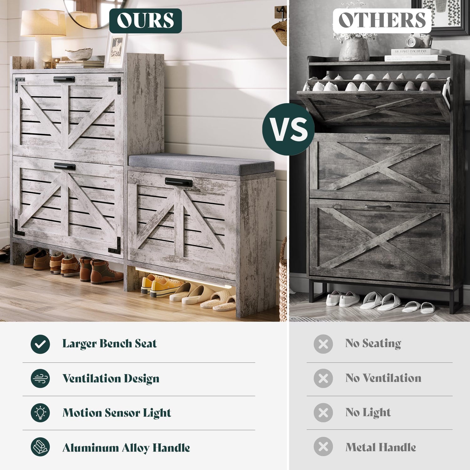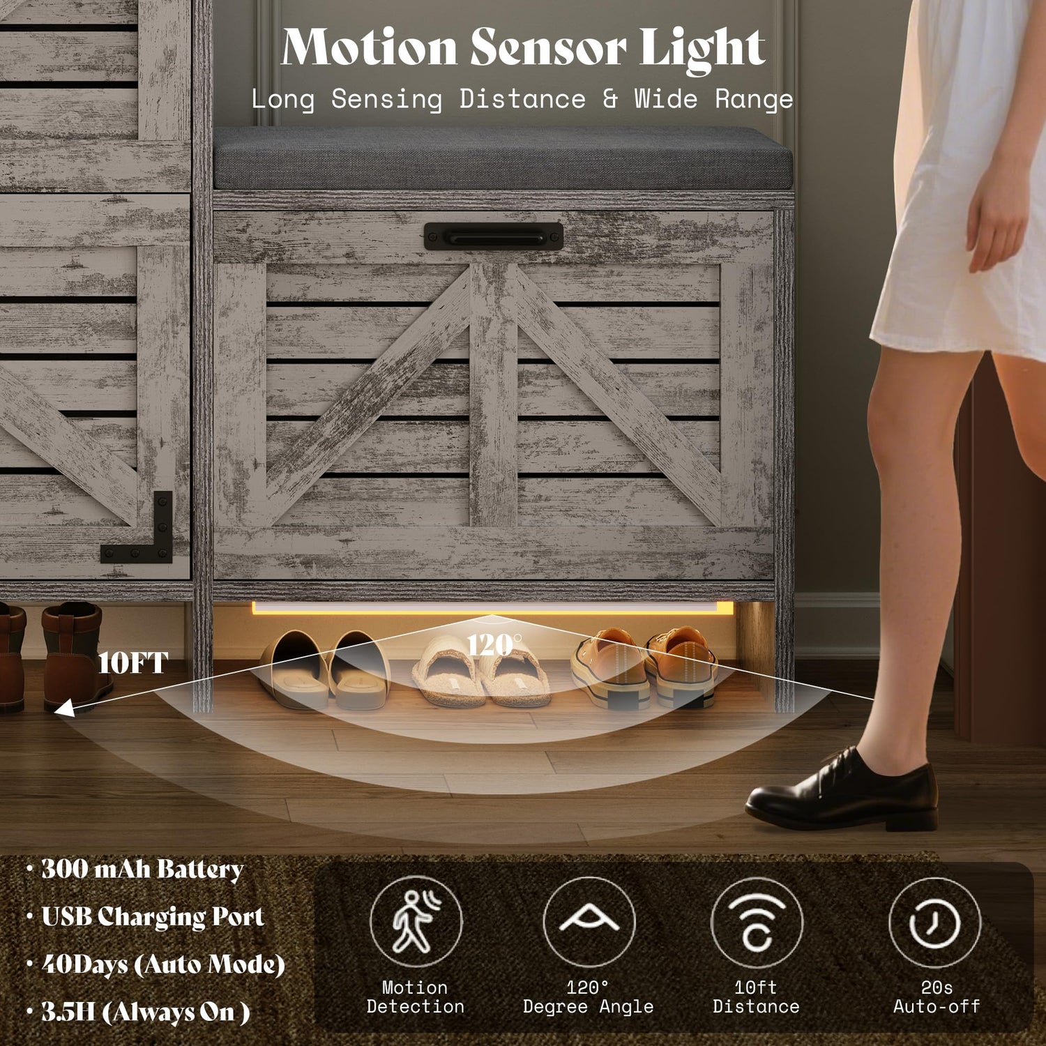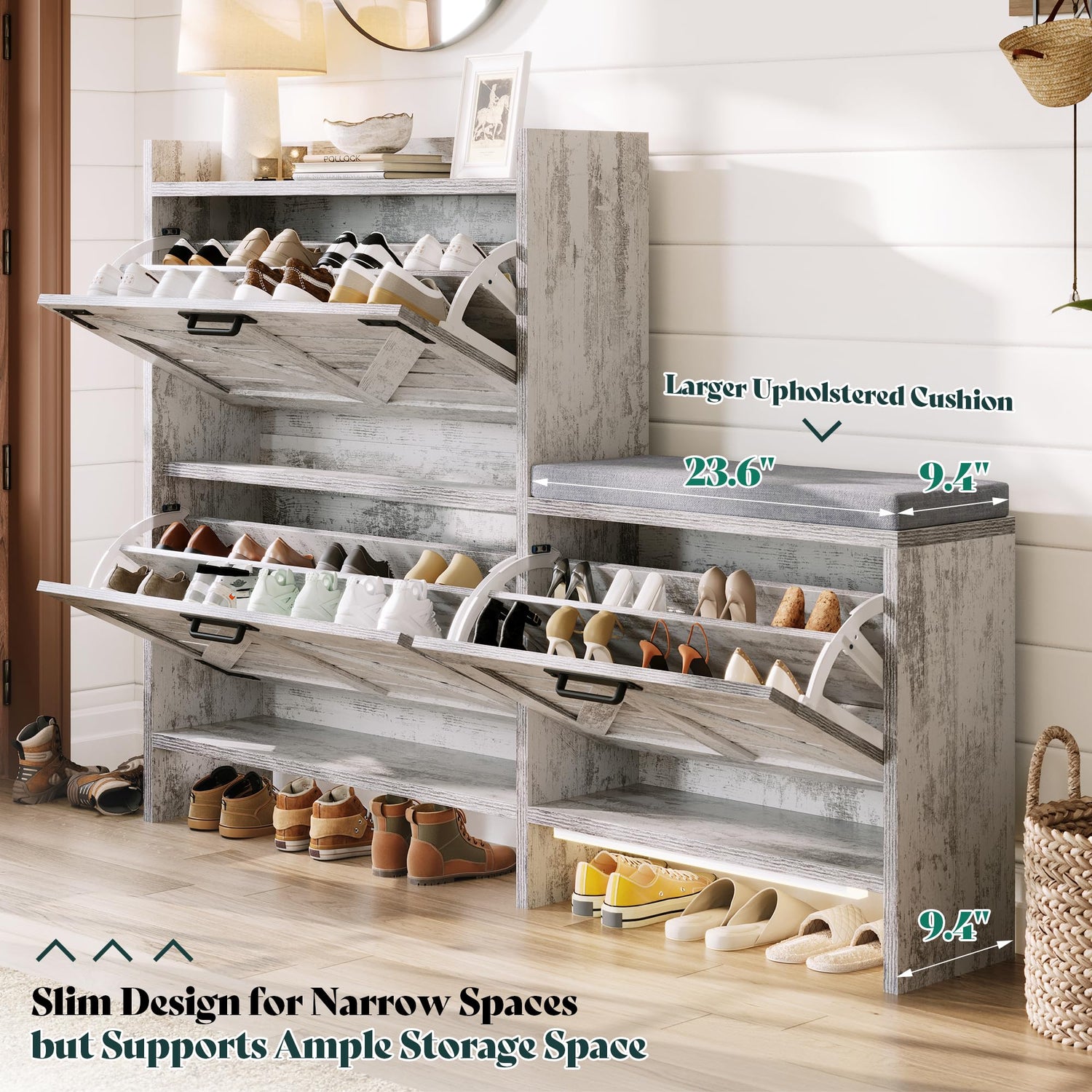 AMERLIFE Farmhouse Entryway Shoe Storage Bench with USB Motion Sensor Light, Flip Drawers & Cushioned Seat, Narrow Hallway Shoe Cabinet for Small Space, Rustic White