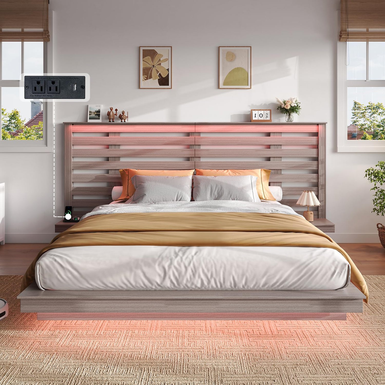 AMERLIFE Taupe Farmhouse Floating Bed Frame with LED Lights, Extended Grille Headboard & Integrated Nightstands
