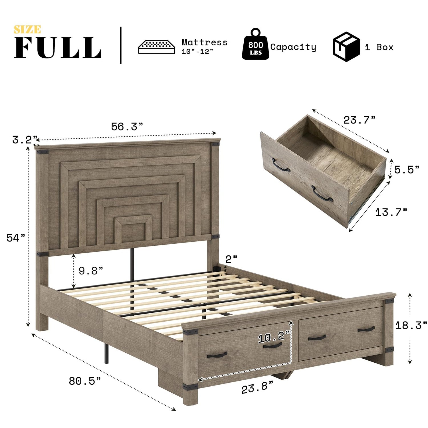 AMERLIFE Farmhouse Full Size Bed Frame with 54" Tall Geometric Headboard & Footboard, Rustic Wood Platform Bed Frame with Large Storage Drawers, Wood Slats Support, No Box Spring Needed, Rustic Grey