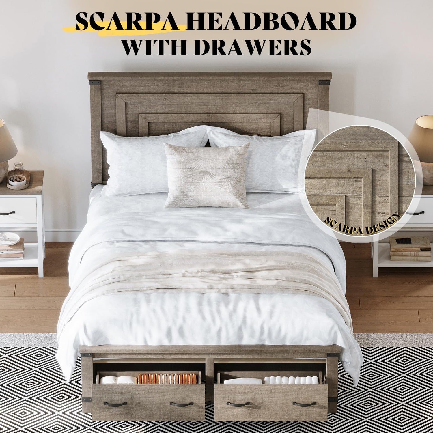 • Stylish & Functional: Elevate your bedroom with our farmhouse bed frame. Combining rustic charm with modern geometric design, the bed frame offers a 54” tall headboard for added comfort. Its spacious drawers provide hidden storage, perfect for keeping your room tidy