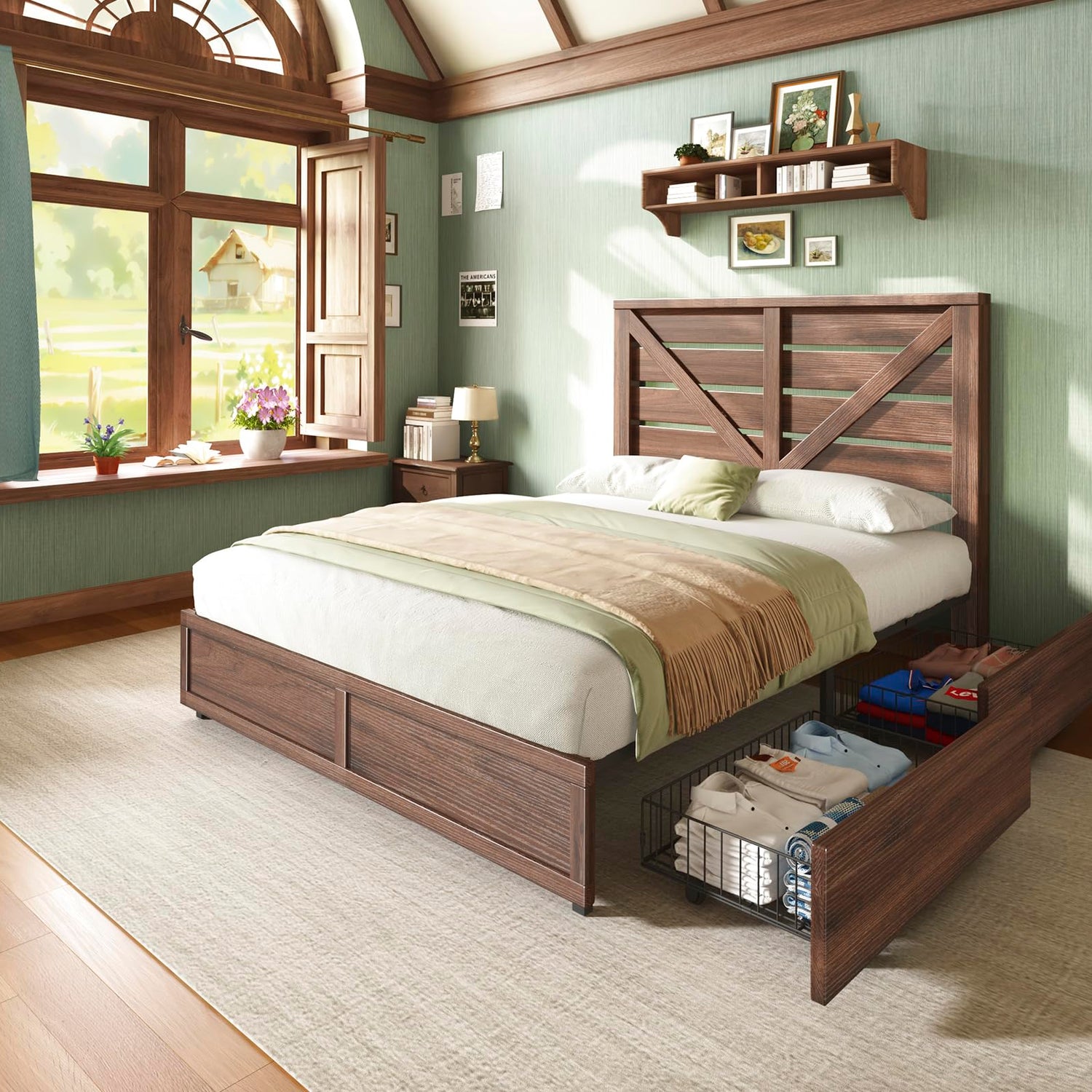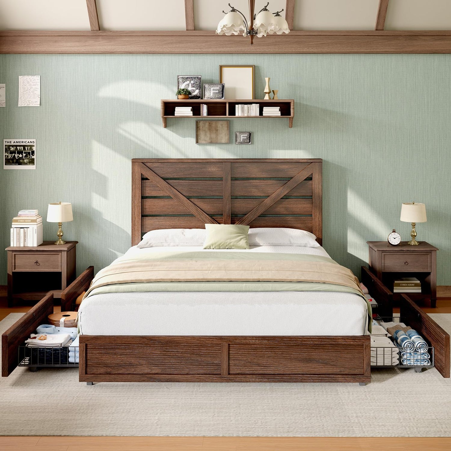 AMERLIFE Full Size Farmhouse Bed Frame with 4 Drawers, Wooden Storage Bed Frame with Headboard and Heavy Duty Metal Slats, Noisy Free, Easy Assemble, Rusric Brown