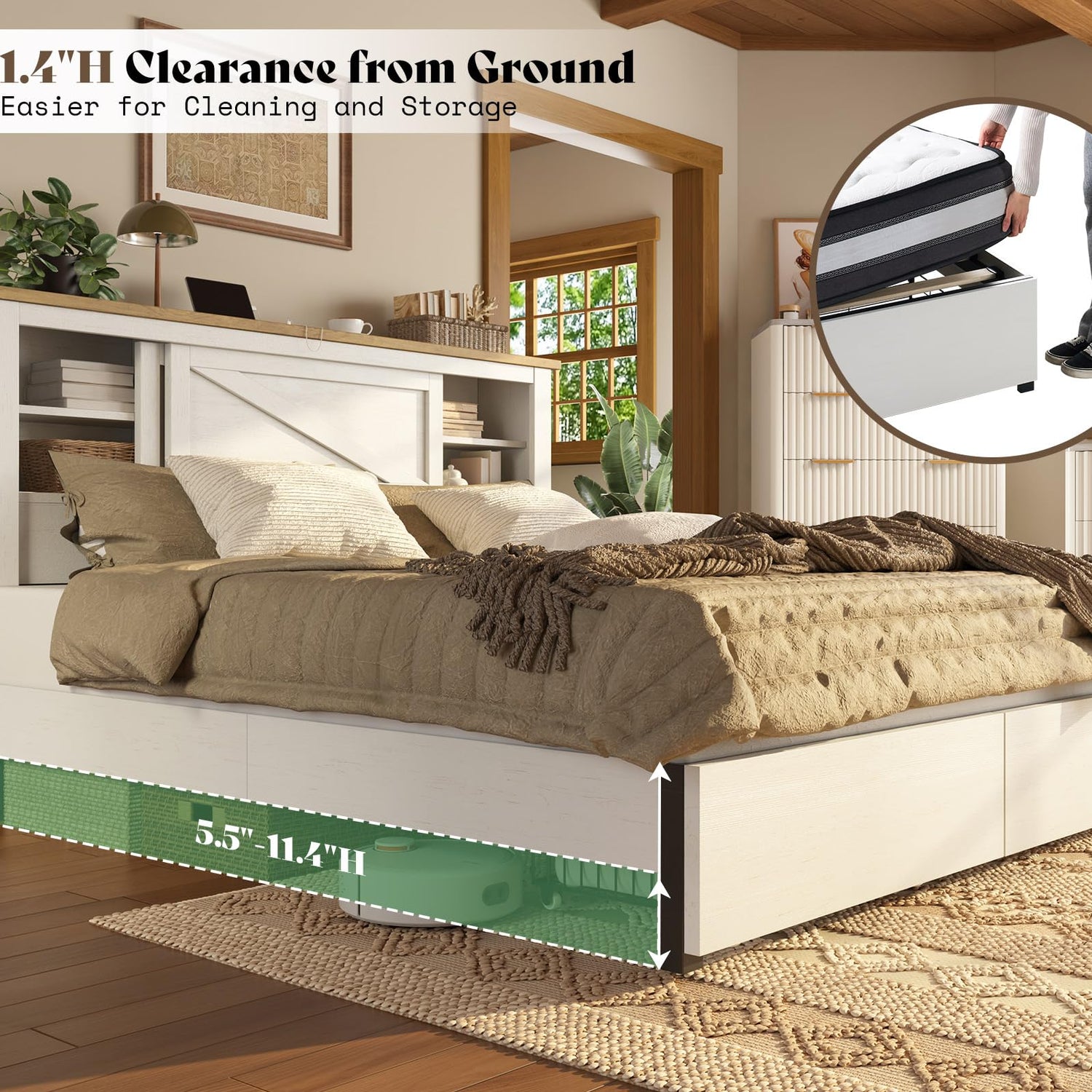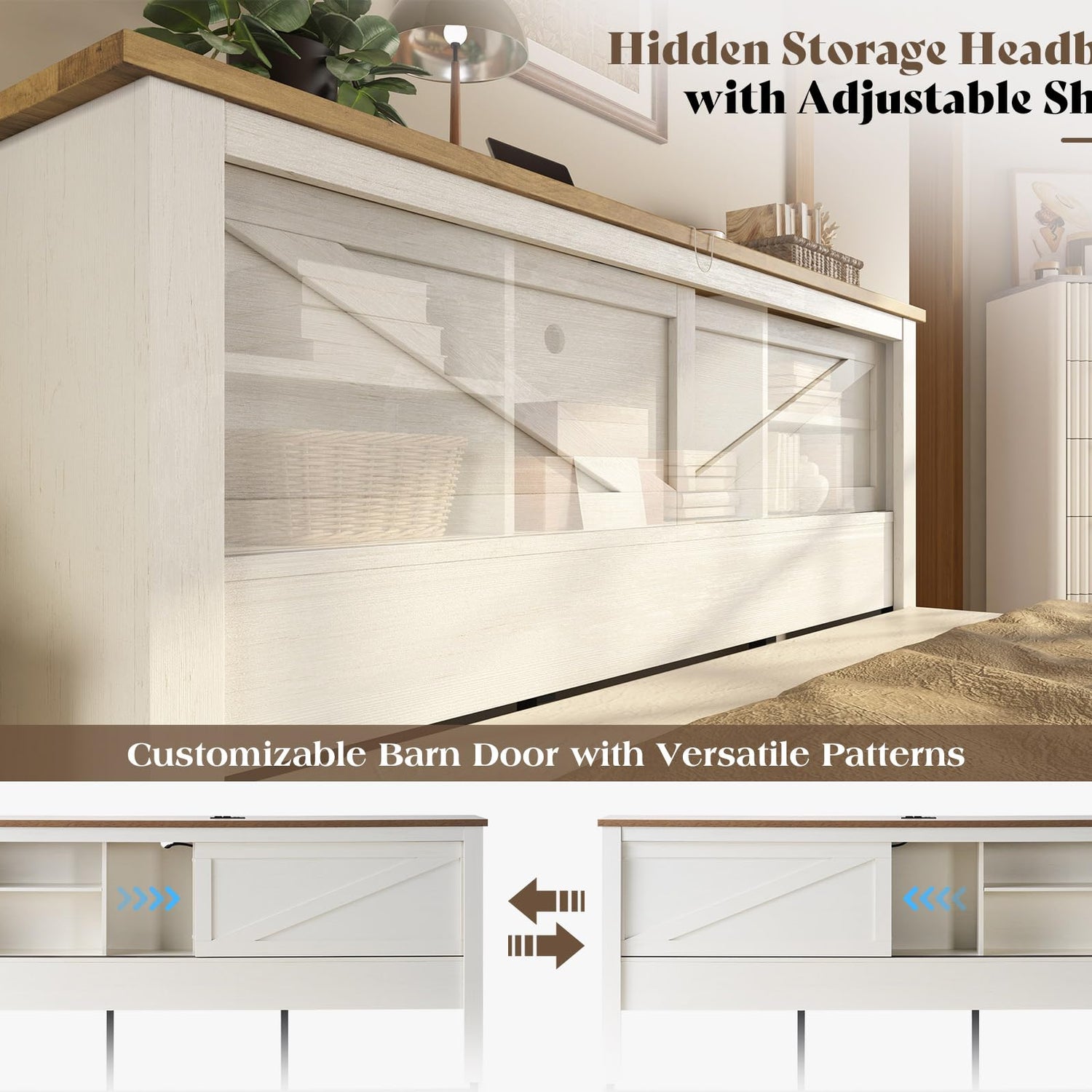 AMERLIFE King 47.2" H Bed Frame with Hidden Space Bookcase Headboard and Charging Station, Beds with 2 Storage Drawers and Wood Slats, No Box Spring Needed, White & Barnwood