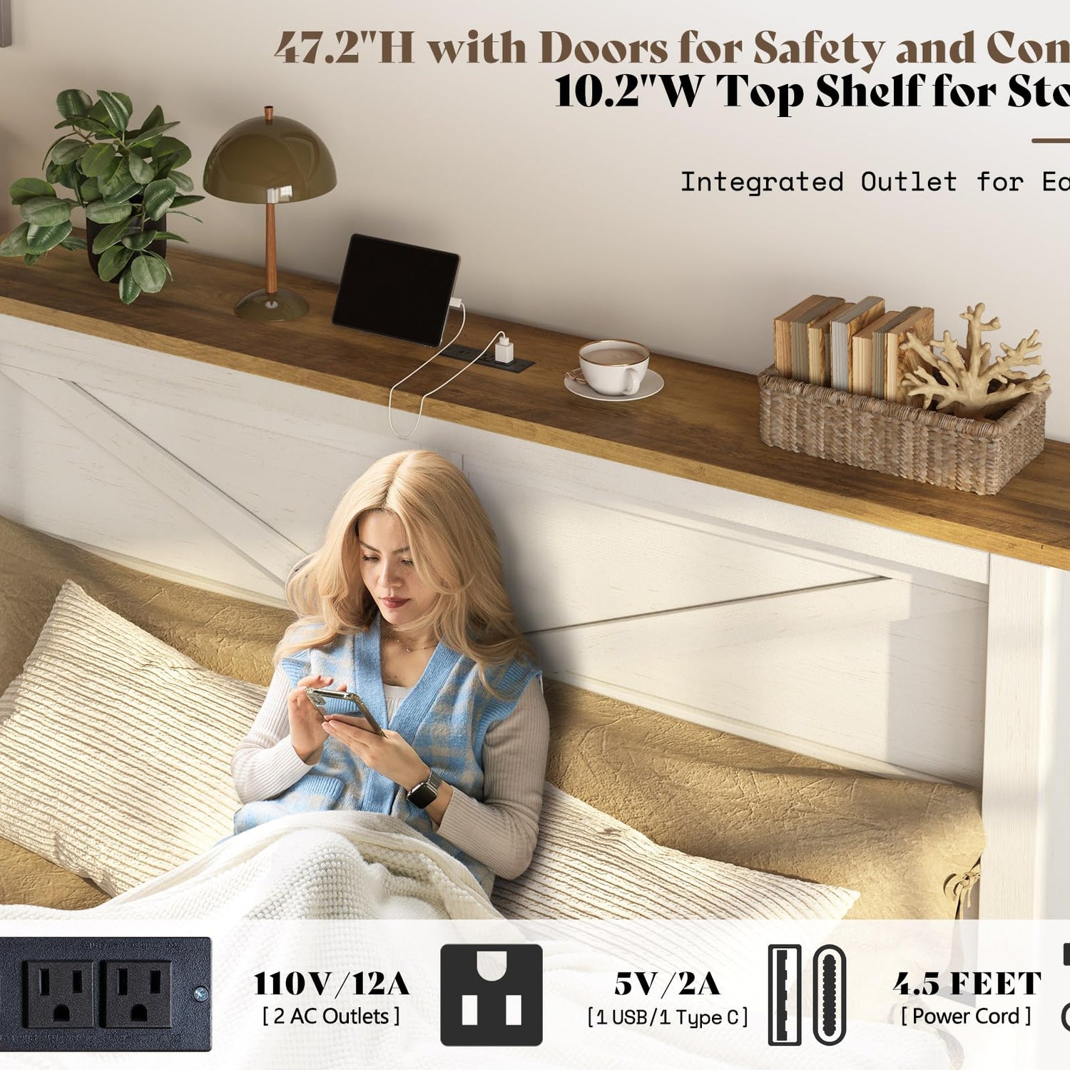 - [Convenient Storage] With a 10.2" W top shelf on the headboard, you can securely store your essentials. The headboard also features 2 standard plug outlets, 1 USB port, and 1 Type-C port. Additionally, 2 drawers provide extra dust-free storage space