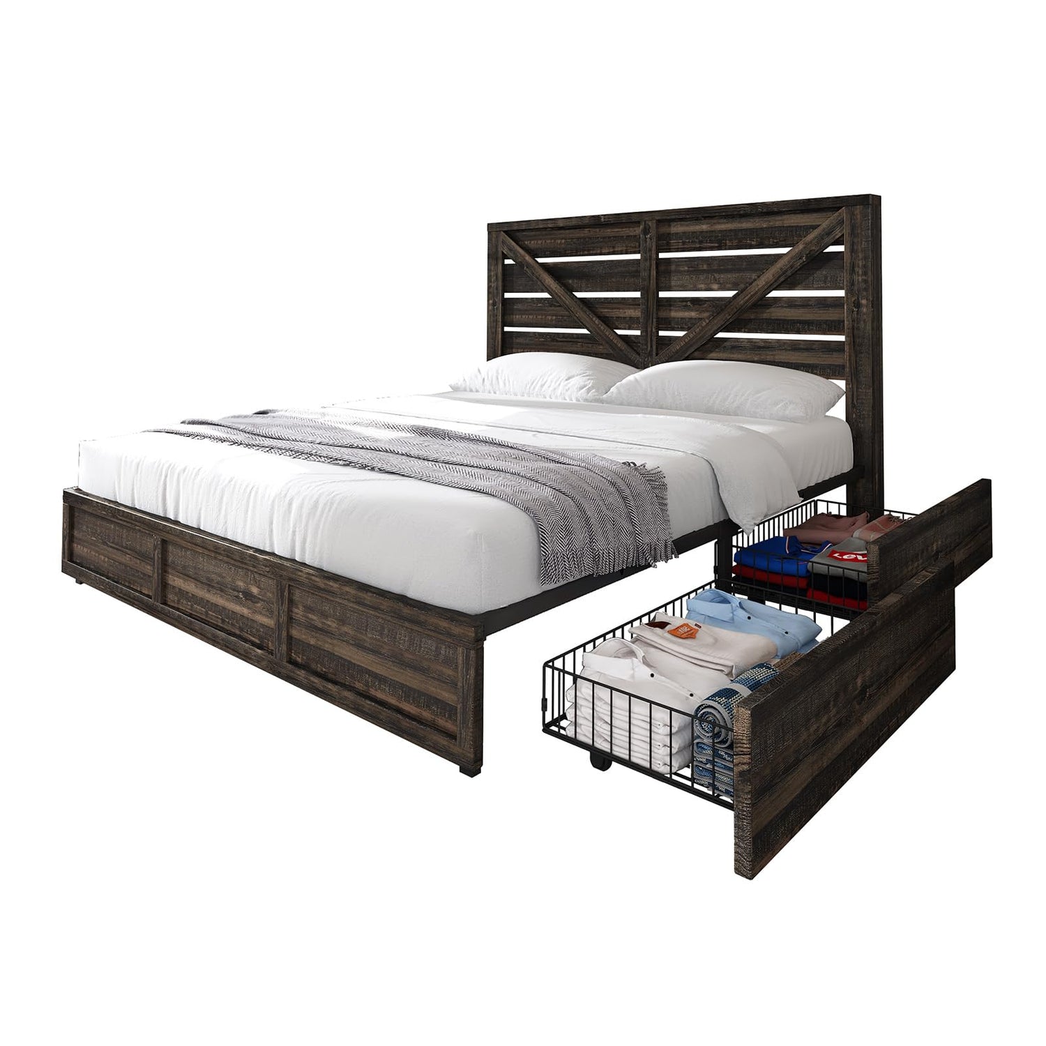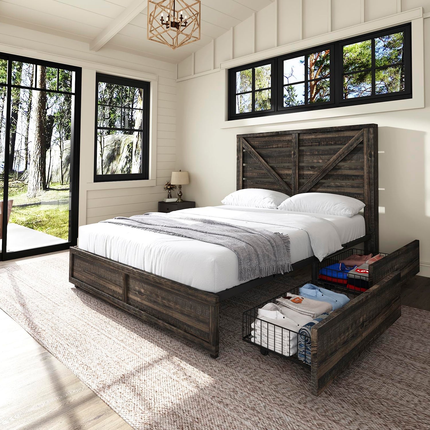 AMERLIFE Queen Size Farmhouse Bed Frame with 4 Drawers, Wooden Storage Bed Frame with Headboard and Heavy Duty Metal Slats, Noisy Free, Easy Assemble, Rustic Black