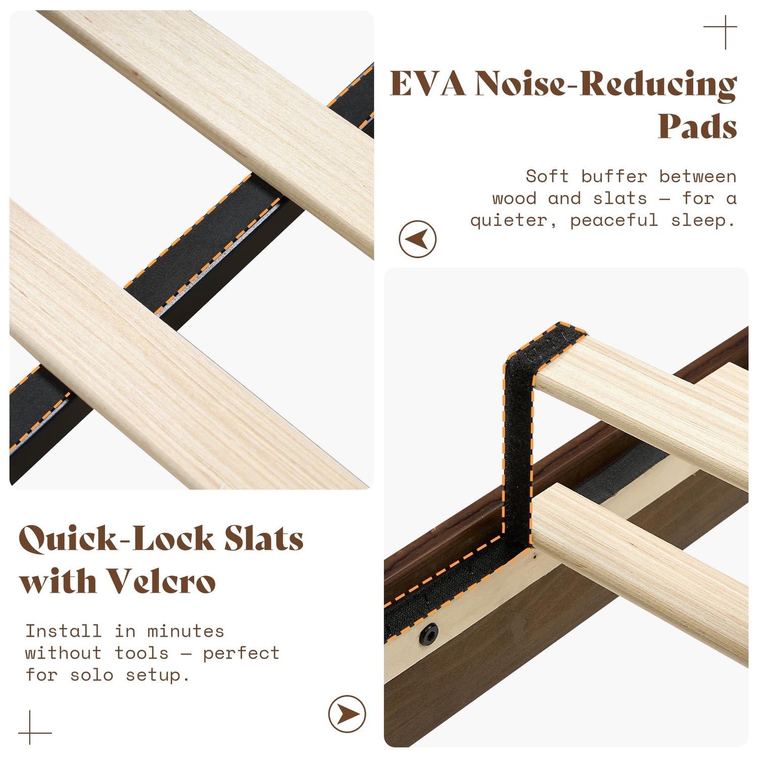 - 【Quiet, Strong, No Box Spring Needed】 Noise-free solid wood slats, EVA foam, and center legs ensure silent sleep. No box spring needed—this wooden platform bed supports up to 1000 lbs with zero wobble.