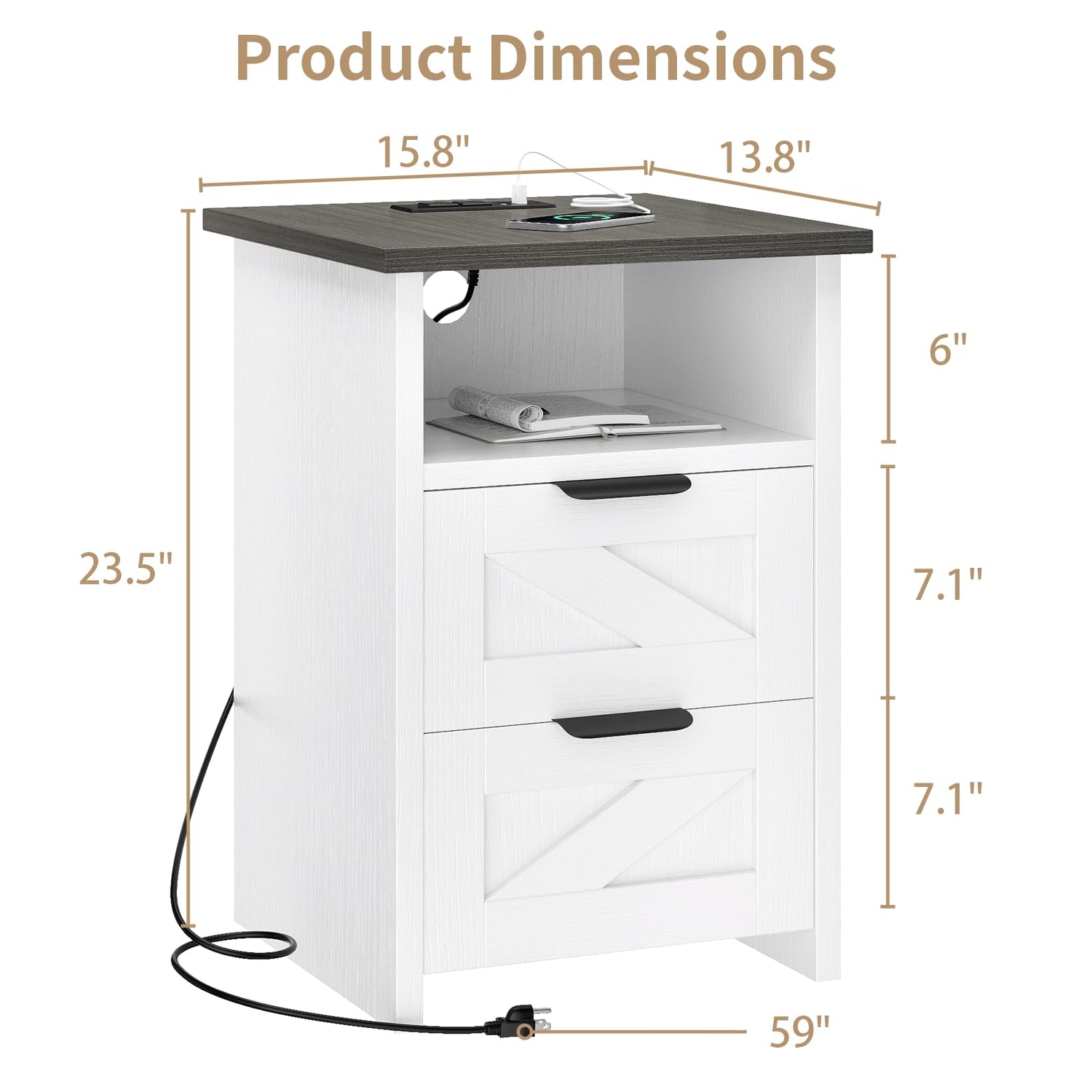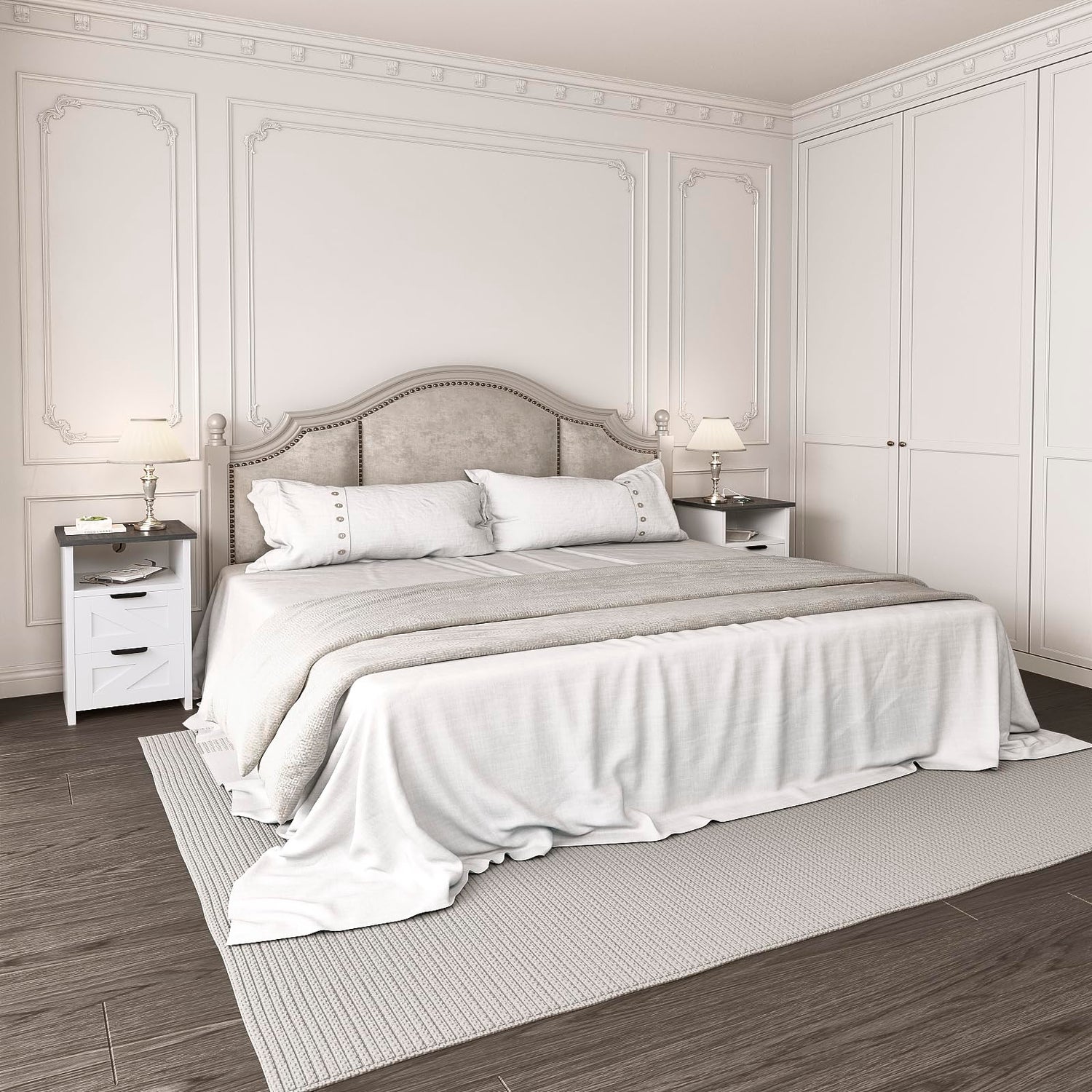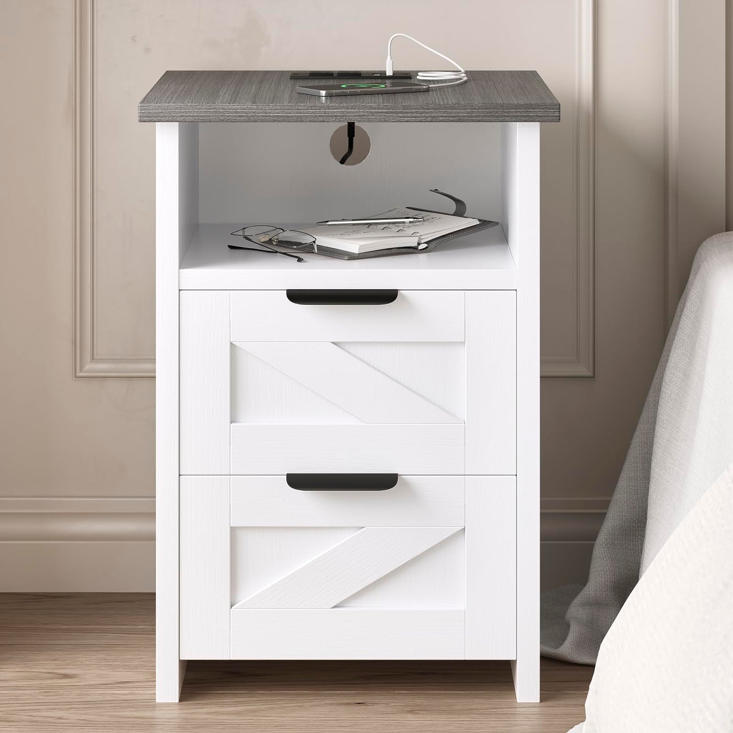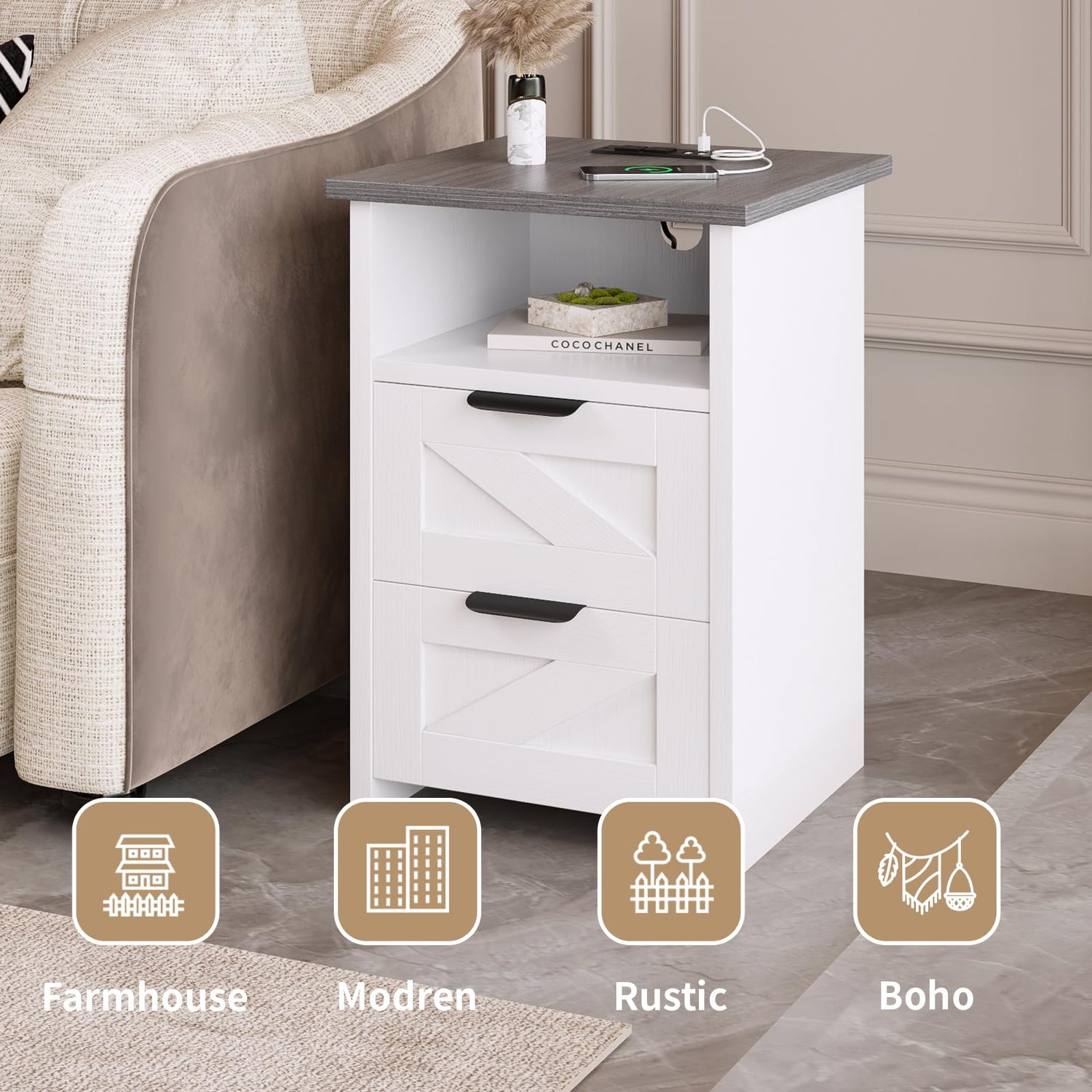 - White Nightstand with Charger Station – This farmhouse nightstand set of 2 is designed with 2 AC outlets, 2 USB ports, and a 7.9ft power cord, allowing you to charge phones, tablets, lamps, or other devices conveniently right at your bedside. With overload protection and safe design, these nightstands with charging station bring both functionality and peace of mind to your bedroom.