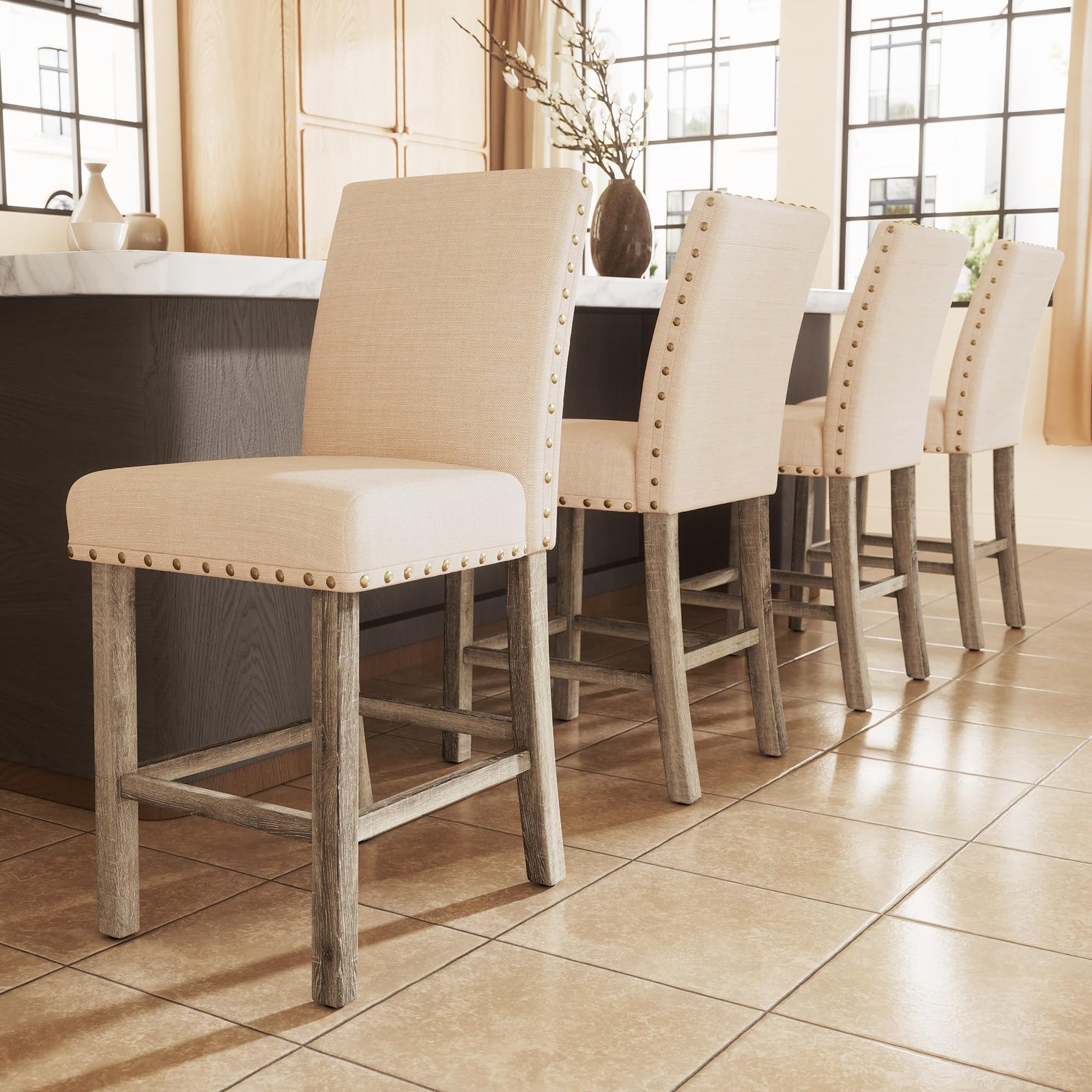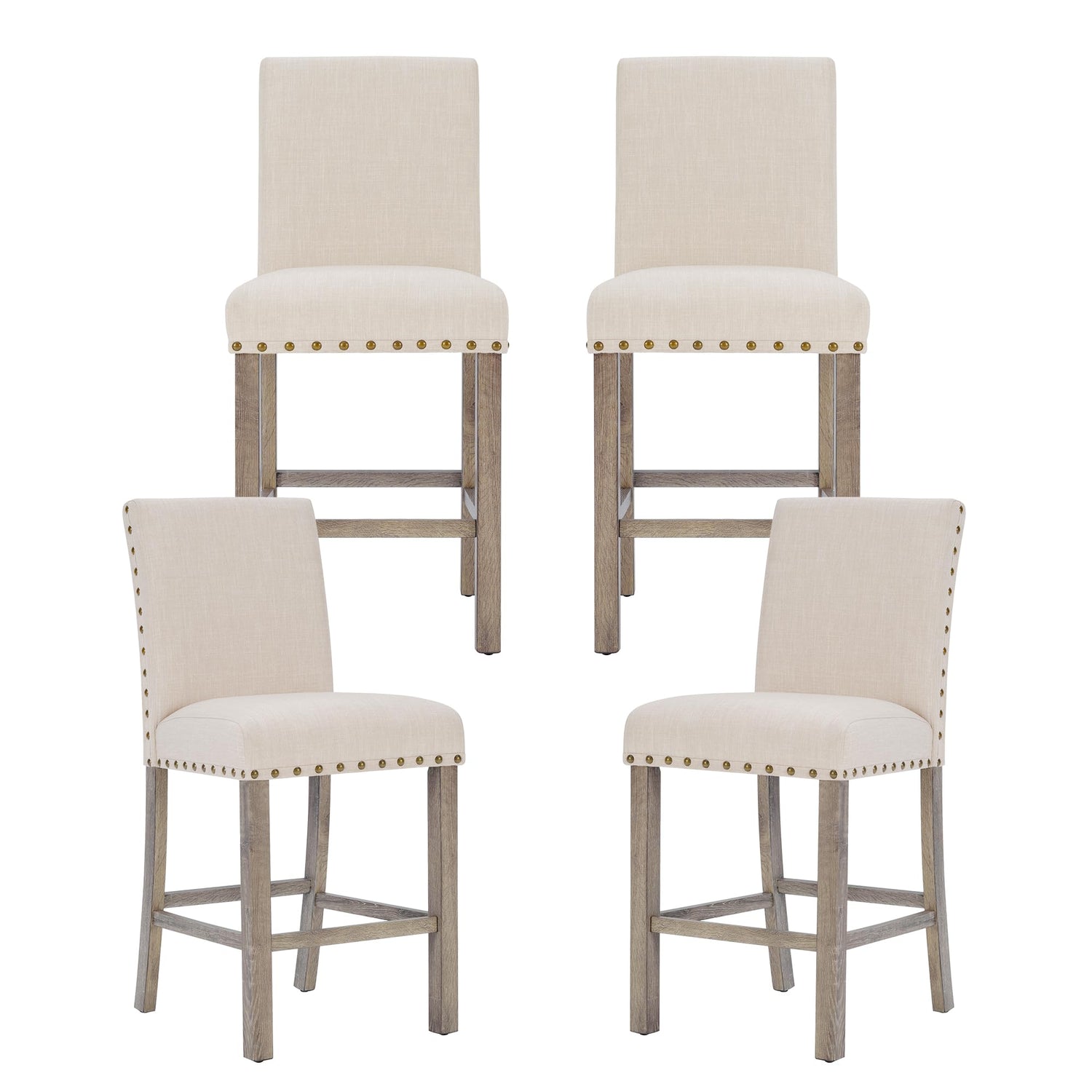 Bar Stools Set of 4, 25.5' Farmhouse Counter Height Barstools, Linen Upholstered Bar Chairs with Ergonomic Backrest and Wood Legs for Kitchen Island, Home Bar, Beige