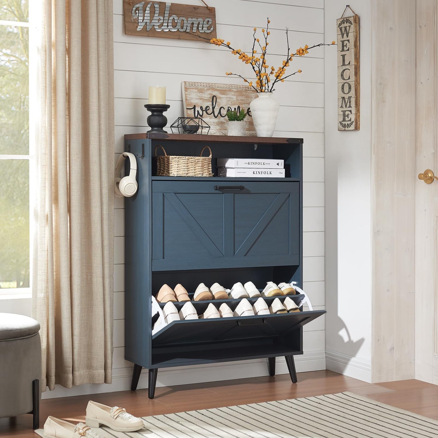 Barnyatoh Shoe Storage Cabinet,Farmhouse Shoe Organizer with 2 Flip Drawers & Barn Door Design,Freestanding Hidden Slim Narrow Shoe Rack Cabinet with Open Storage for Entryway, Foyer,Hallway,Blue