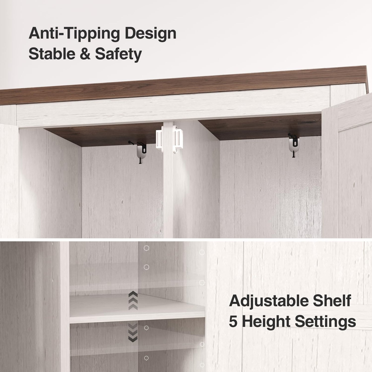 • Enhanced Stability and Safety: This white cabinet is made of engineered wood and is equipped with an arched structural base. Its structural design is meticulous and it is stable without any shaking. Moreover, it is also equipped with a sturdy anti-tip device to ensure the safety