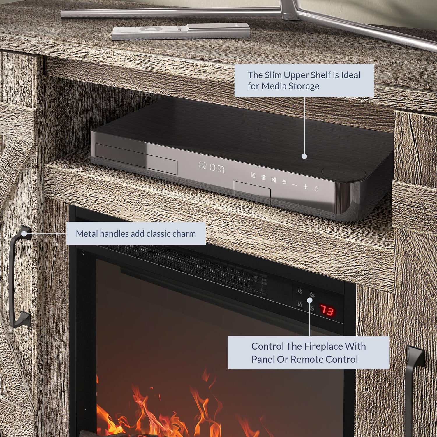 Details: Looking for a TV stand that brings together rustic design with an industrial flair and a modern silhouette? This entertainment console is just what you’re looking for. It has a distinctly retro look with country-inspired barn-style cabinet doors and a lovely Ashland pine finish. X-shaped panel detailing gives the extra edge and the antique metal hardware lends a beautiful touch. Add to this the cozy warmth generated by the infrared fireplace. It warms up the room—curl up on the couch, snuggle up with a blanket, and enjoy the comfy feeling of being at home with your loved ones. If you love the charming look of a traditional fireplace, but dislike the smoke and soot associated with it, this TV stand with the embedded electric fireplace is the perfect solution. It showcases a realistic flame with smoldering wood for a beautiful look. Clear the clutter and give your home a clean look with this storage cabinet that offers ample room. There are adjustable shelves that you can move around to ensure a good fit for the items you intend to store. Two cabinets provide a spacious area and there are cable cutouts to keep wires and cords neatly organized. You’ll love how versatile and functional the piece is. It’s not just the best entertainment center for your living room but can serve as a buffet in your kitchen or dining room. When guests walk through your entryway, they’re sure to be wowed by the rustic elegance of this cabinet. For your bedroom, this unit doubles up as a storage cabinet and an accent table. It’s made with high-quality manufactured wood, so it’s durable and long-lasting. It can fit TVs up to 50 inches. Overall dimensions include: 47"(L) x 15.37"(W) x 30.68"(H).