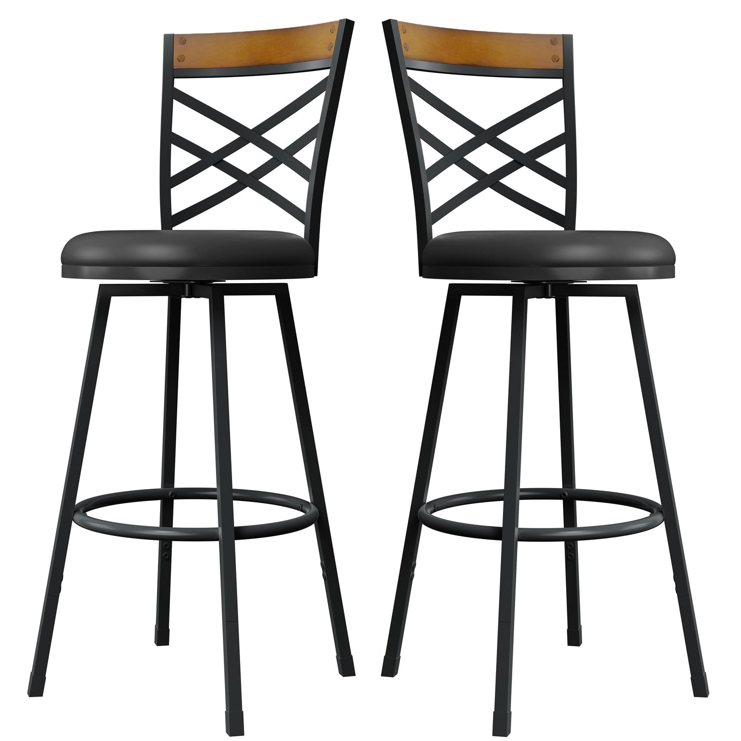 BOSHIRO Black Bar Stools Set of 2 - Rustic Wood & Metal Swivel Barstools with Curved Backrest, 360° Rotation, Adjustable Height Dining Chair for Living Room, Kitchen, Bar