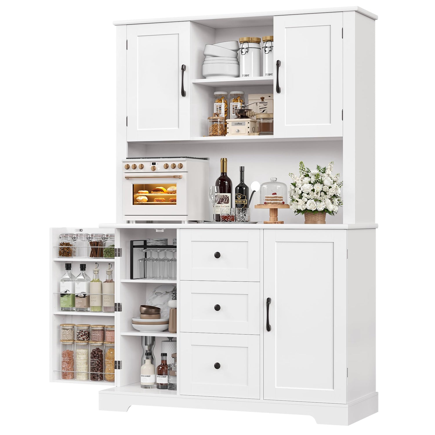 • Struggling with a messy kitchen? Our pantry cabinet is here to rescue you! Boasting 11 compartments in various sizes, 3 drawers, and a capacious countertop that can hold 3 appliances simultaneously, it offers abundant storage space for all your kitchen essentials. The 3 extra spice racks with adjustable heights let you customize the storage layout, perfect for organizing spices, olive oil jars, and other kitchen itemsTimeless Glamour: Crisp white body adorned with barn doors and black metal handles strikes the rustic brown surfaces in an elegant and beautiful way, which fuses blendlessly the modern asthetic with classic vintage appeal