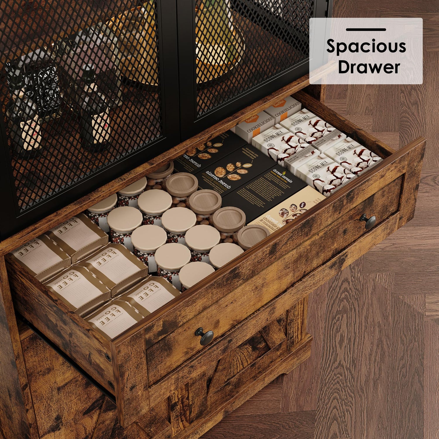 - 【Diverse Storage Space】 The kitchen storage cabinet provides 9 storage spaces. The 2.4-inch height top can be used to store items and prevent them from falling. The 3-layer visible shelves above are suitable for displaying decorations or fruits and vegetables and keeping them ventilated and breathable, the wooden drawer is enough to organize tableware, and the 4 adjustable shelves at the bottom meet your different storage needs, providing privacy and prevent dust accumulation