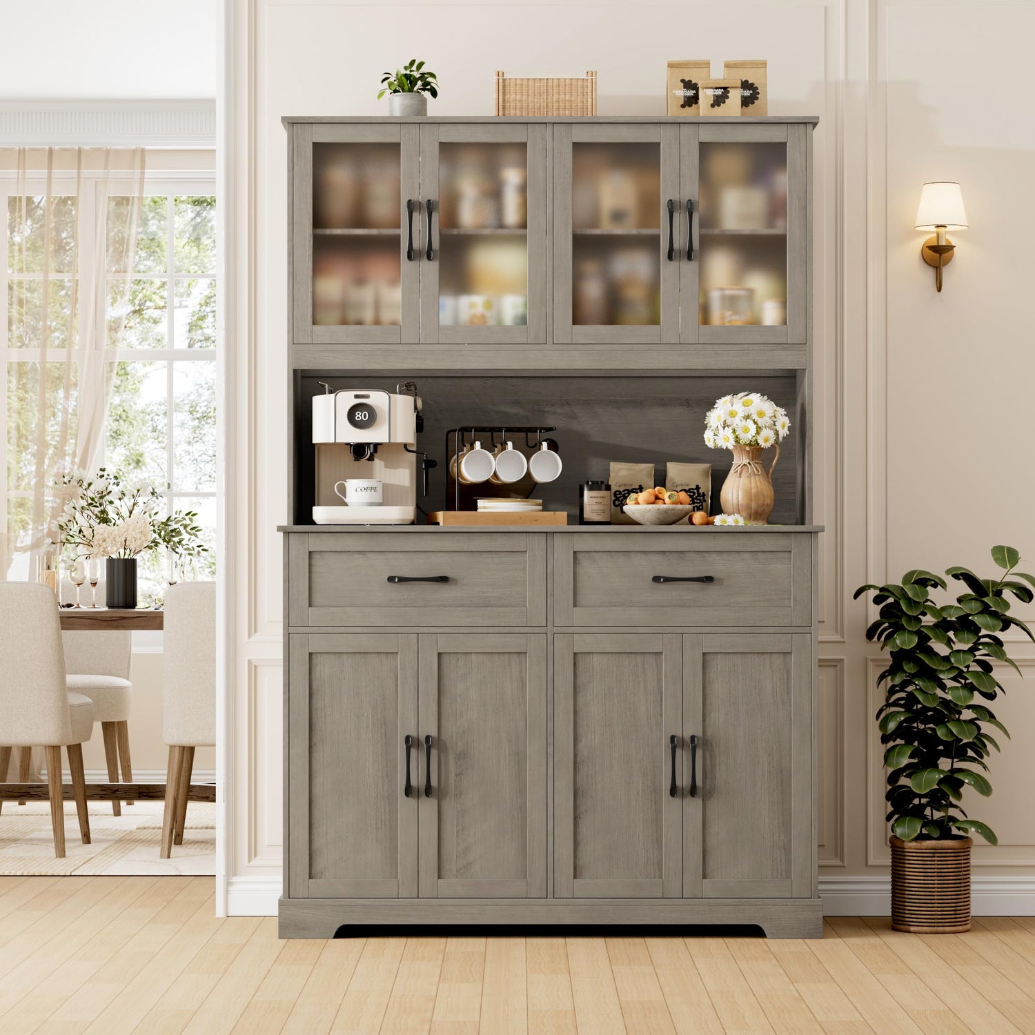 BOTLOG 71" Pantry Storage Cabinet, Farmhouse Food Pantry Cabinet with Microwave Stand, Kitchen Hutch with Large Drawer and Shelves for Dining Room Farmhouse Grey