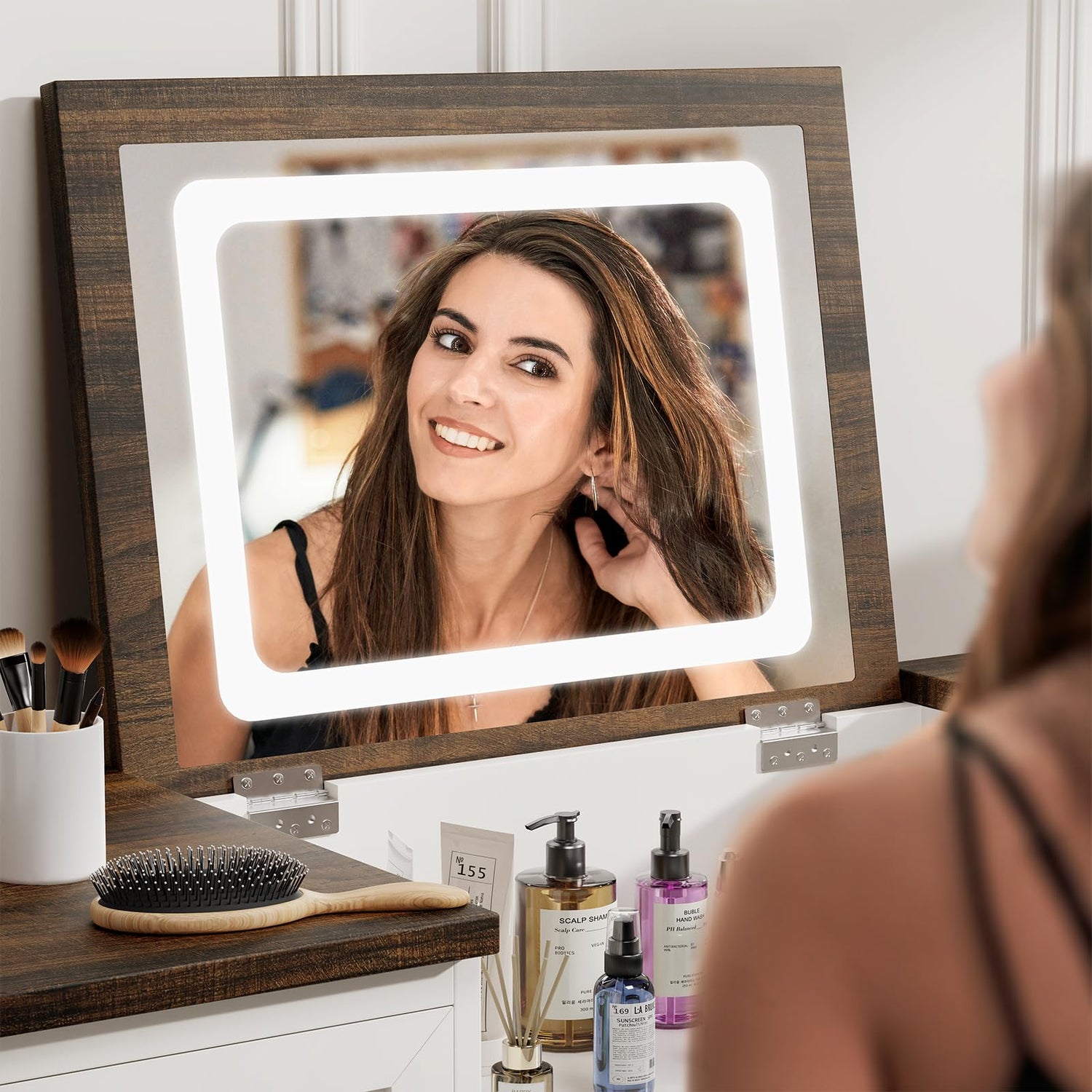 - 【Hidden flip-up LED Mirror】The built-in LED mirror on the dresser desktop makes your daily life more convenient. The makeup mirror is surrounded by LED light strips, with 3 color lighting modes and 0%-100% brightness adjustment. It can provide perfect light for your makeup anytime, anywhere, meeting your different makeup needs.