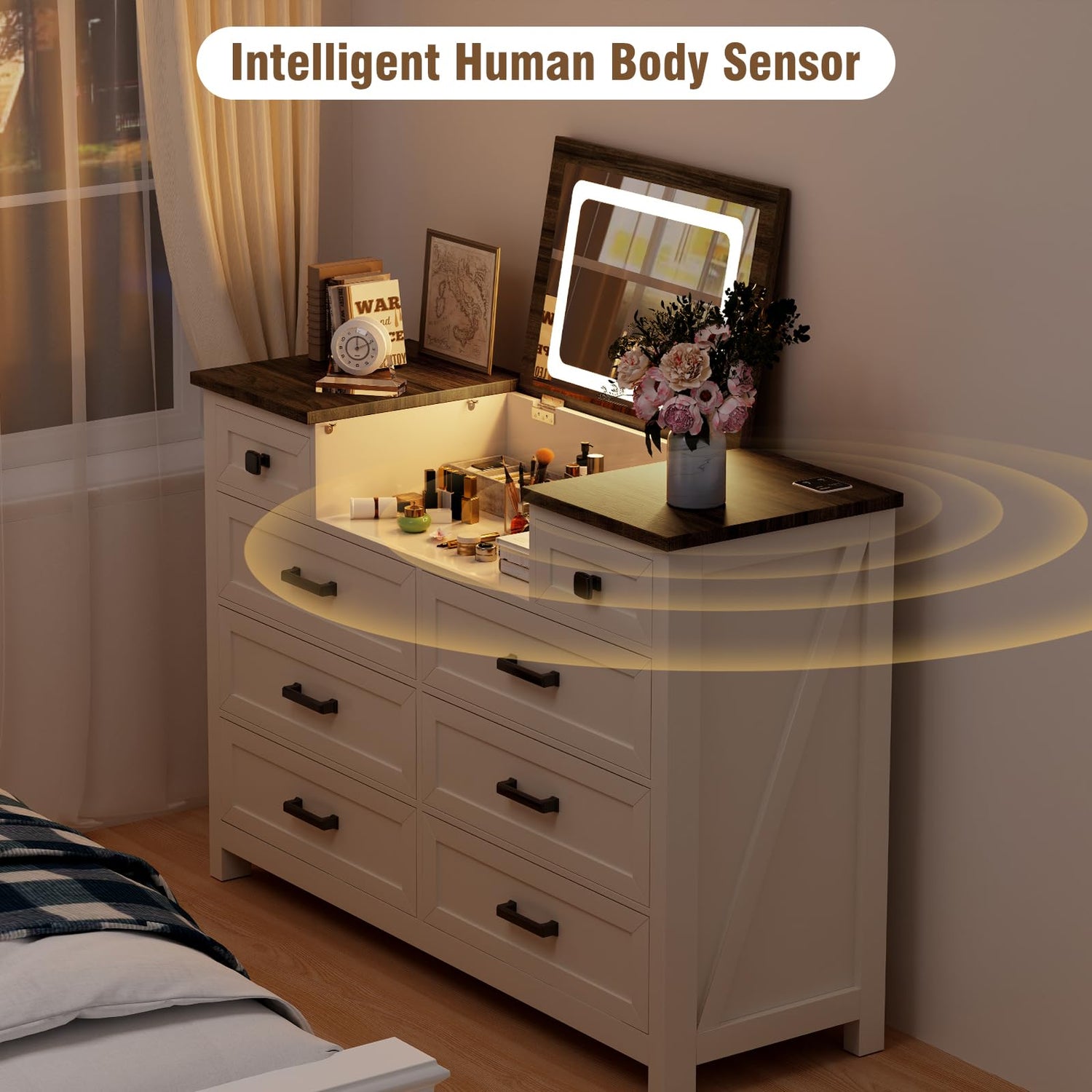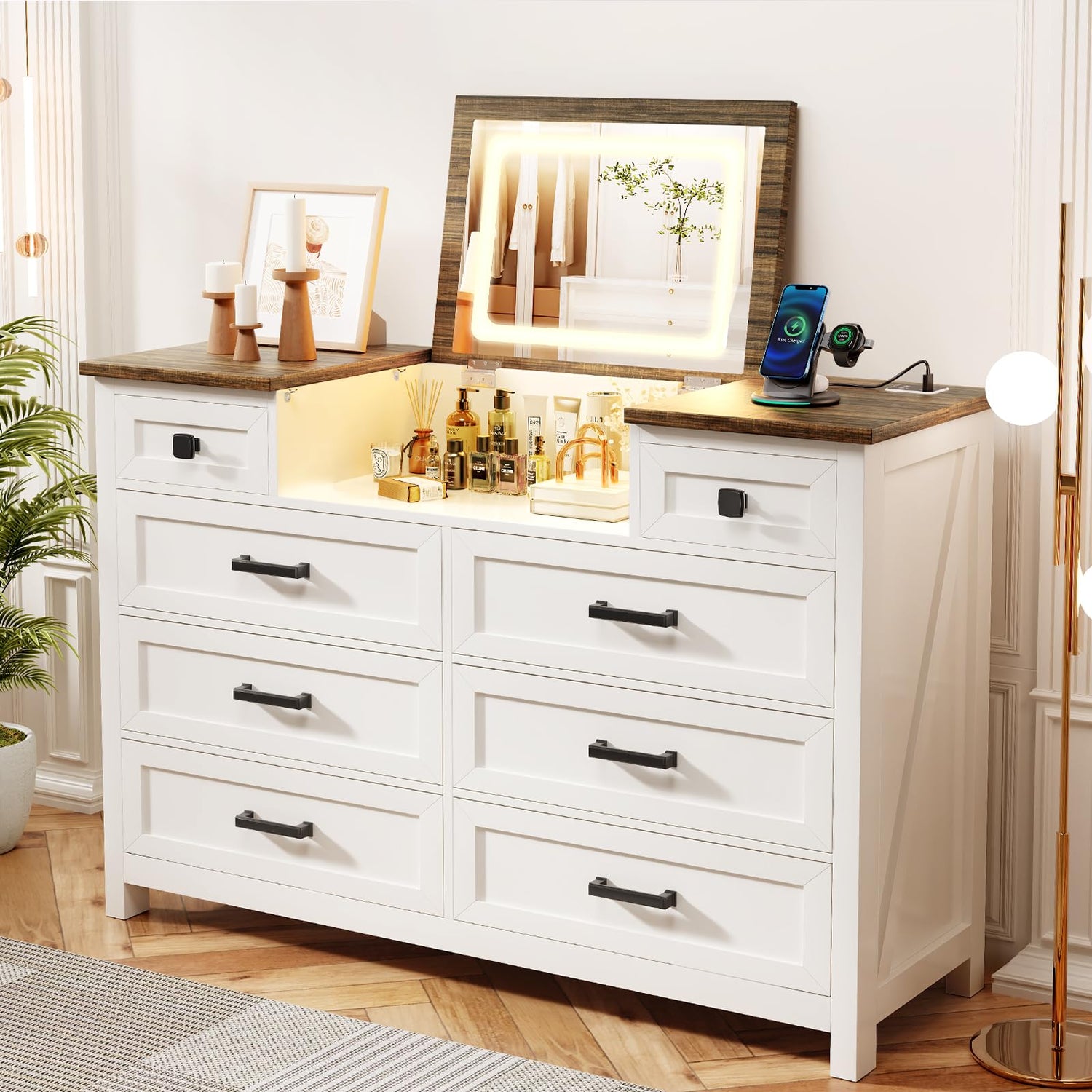 BROTTAR Dresser with Mirror for Bedroom, Chest of Drawers with LED Mirror, 8 Drawer Dresser with Charging Station, White Kids Dressers, Farmhouse Makeup Vanity with Storage for Bedroom