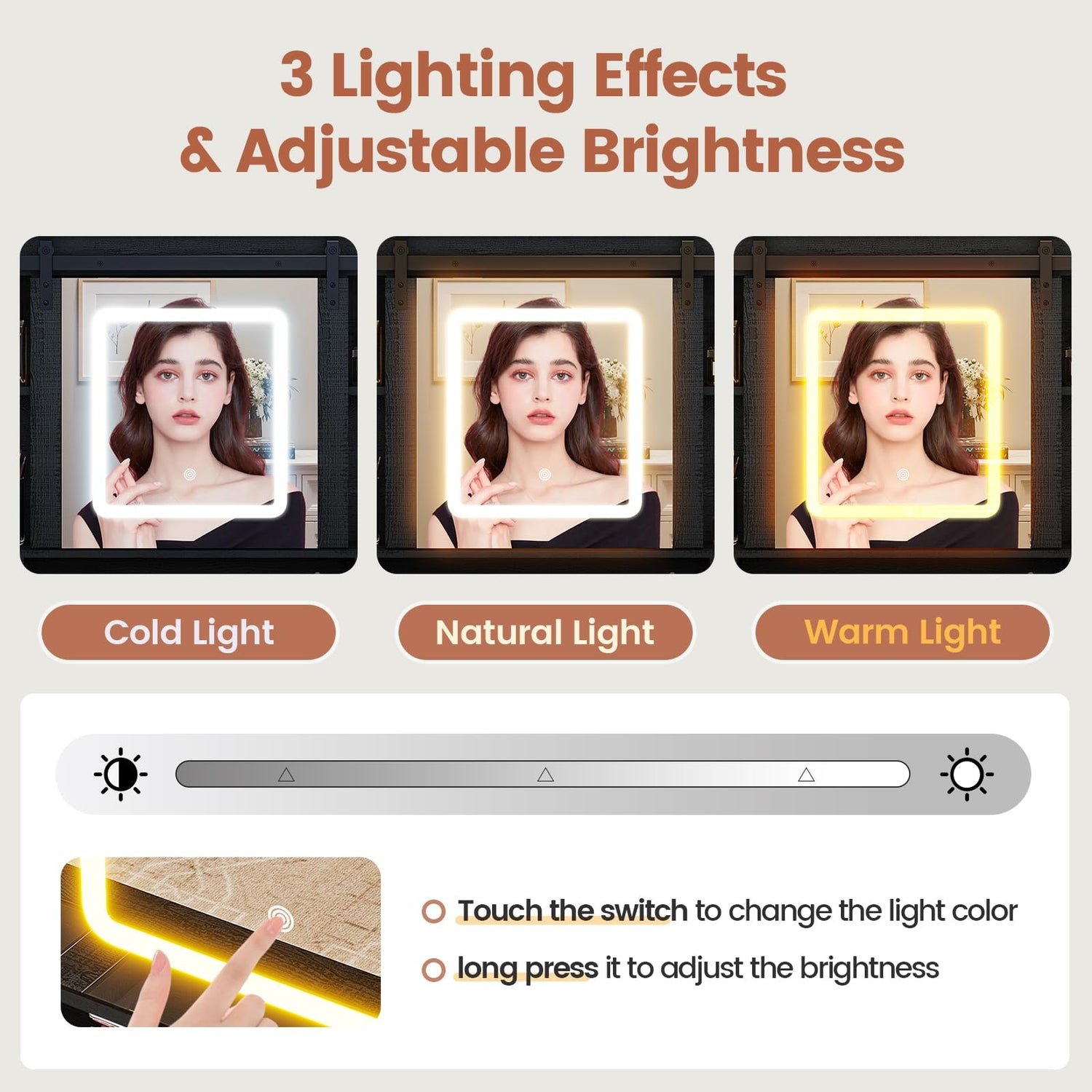 - 【3 Color Modes of Light】The vanity desk with mirror is equipped with LED lights to provide you with bright and soft light. There are 3 light colors for you to choose from: cool white (for official makeup), warm white (for skin care or daily makeup), warm yellow (for dinner or party makeup), and the light brightness can be adjusted for each color.