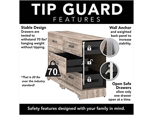 - Tip Guard safety features include a stable design, counterweighted back panel, wall anchor and Open-Safe Drawers