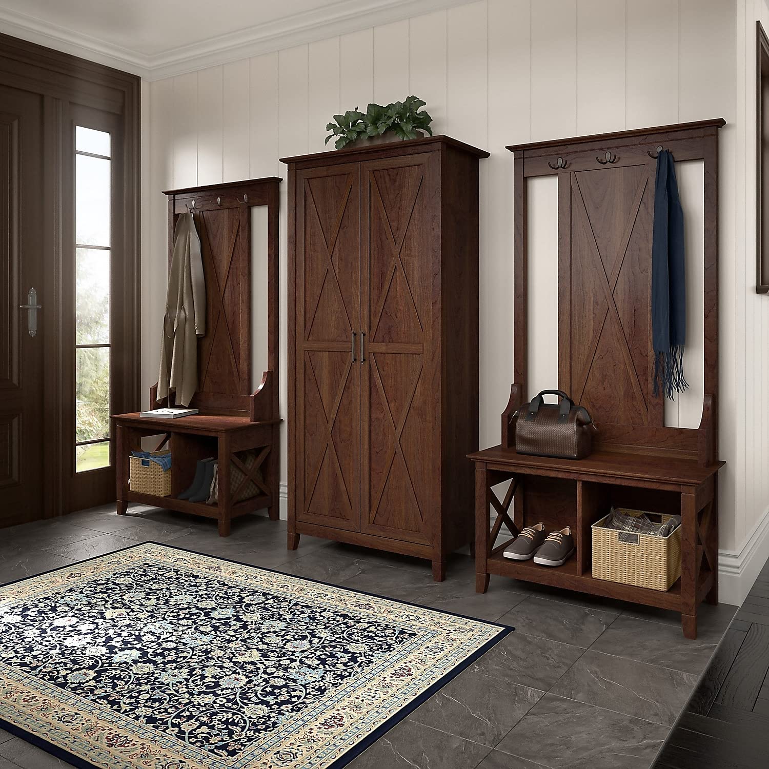 Bush Furniture Key West Hall Tree with Shoe Storage Bench in Bing Cherry, Entryway Organizer for Home, Multi-Purpose Storage Solution with Seating and Hooks