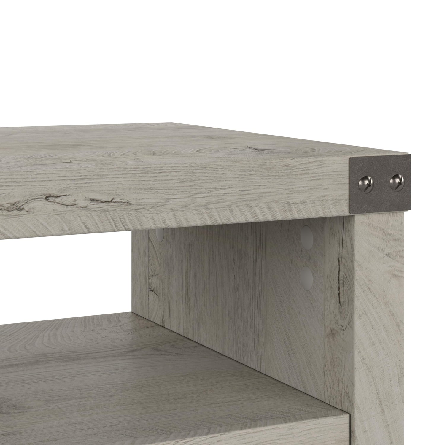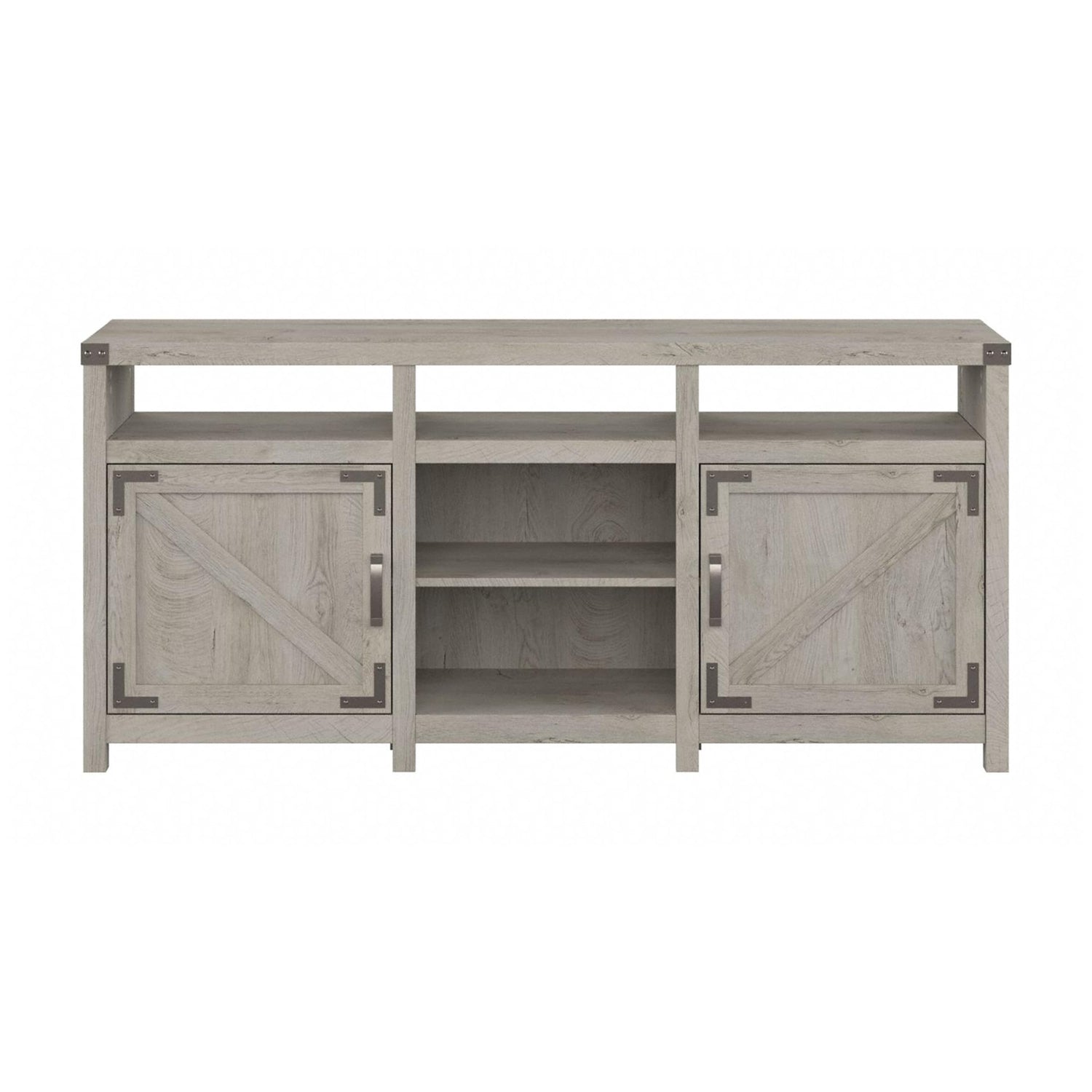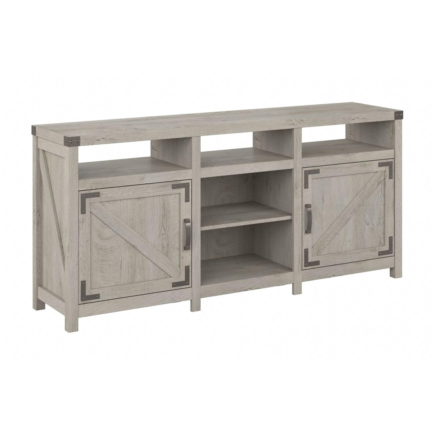 Details: The Bush Furniture Knoxville 65W Farmhouse TV Stand for 75 Inch TV offers a practical living room entertainment solution with appealing modern farmhouse style. Host movie night with family and friends or kick back and relax with your favorite show in front of this large, durable TV Stand. The surface supports up to a 75 inch flat-screen television and/or 90 pounds while the entertainment center's upper shelves are perfect for components like a DVD player and video game console. Storage cabinets on the right and left each contain one adjustable shelf for flexible organization of movies, games and other entertainment essentials. The open center compartment also features an adjustable shelf for additional storage space or for displaying pictures and decorations. Knoxville's rustic styling is highlighted by its sturdy and attractive post leg designs, diagonal wood accents, Dark Bronze hardware and your choice of Reclaimed Pine, Cottage White or Restored Gray finishes. This 65 Inch TV Stand with Storage has been rigorously tested to meet or exceed industry standards for safety, durability and performance and is backed by the Bush Furniture 1 Year Manufacturer's Warranty.