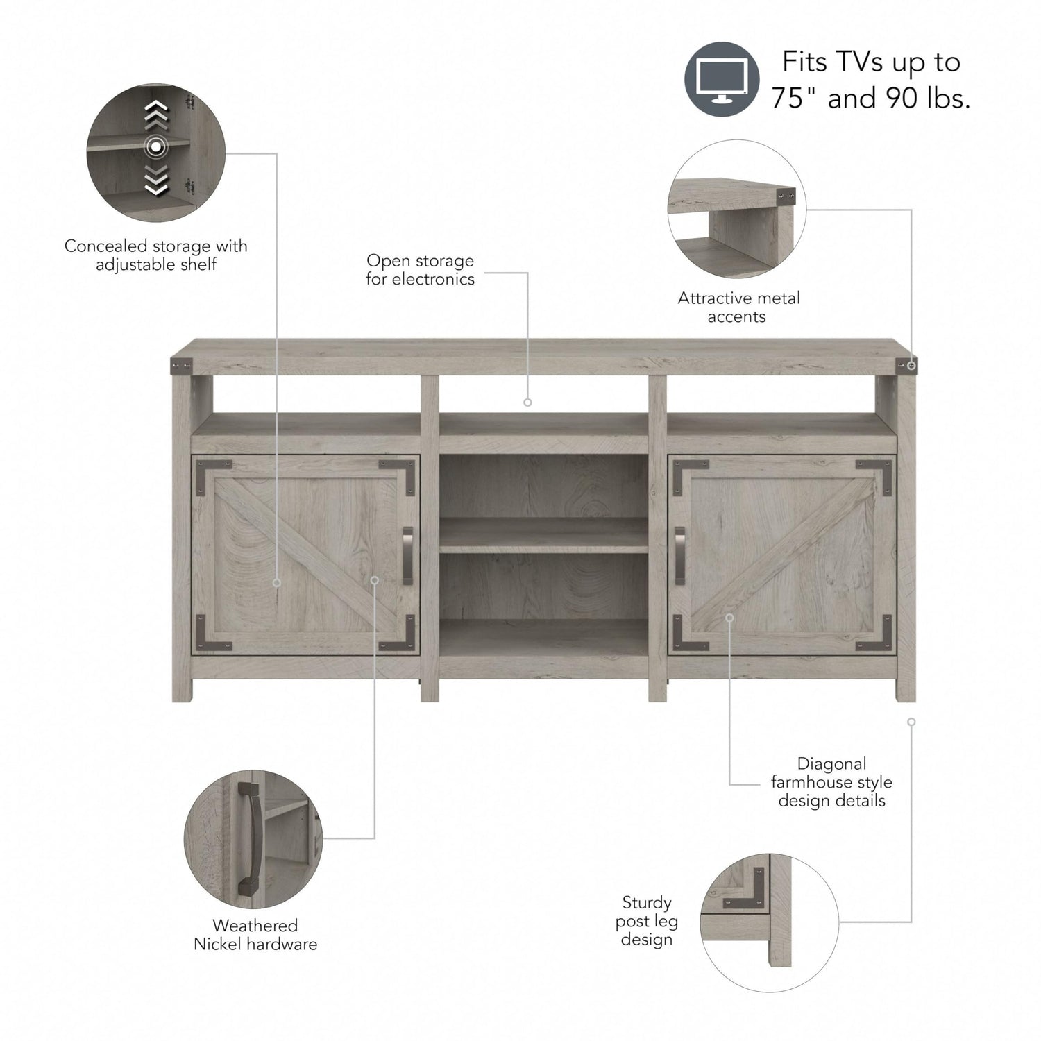 - TESTING AND WARRANTY: This Farmhouse TV Stand with Storage has been meticulously tested to meet or exceed industry standards for safety, durability, and performance and is backed by the Bush Furniture 1 Year Manufacturer's Warranty.