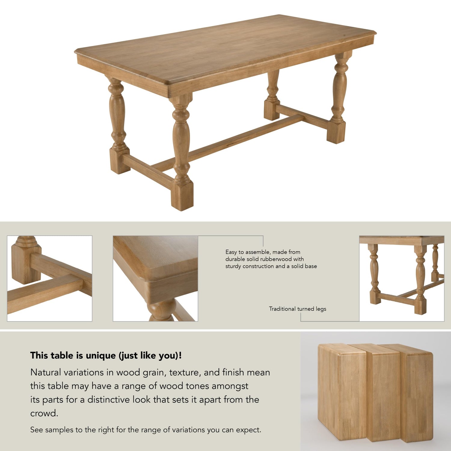 - QUALITY MATERIALS: Built from durable solid rubberwood, this table is designed to withstand daily use, from casual meals to special occasions. The natural variations in wood grain and texture ensure each table is unique, adding character to your dining area.