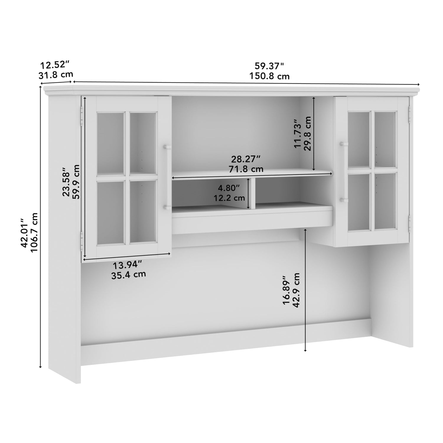 Details: The Bush Furniture Westbrook 60W Computer Desk Hutch is a perfect solution to add storage and display capacity to your work or living space without taking up precious floor space. The hutch with doors attaches to coordinating Westbrook Computer Desks and the 60W Sideboard Cabinet (sold separately). Thanks to this practical desk hutch, you can add your own personal touch to your home office with small plants and decorative items, without crowding your work surface. Adding a storage hutch to your desk or sideboard helps you take advantage of the vertical space in your room. The office hutch features lovely windowpane glass doors to conceal materials and keep valuable items safely tucked away. The cabinet doors are adorned with long matte black handles and exposed barrel hinges that reflect the best elements of modern and farmhouse styling for an elevated look. Each glass door cabinet contains one adjustable shelf for versatile storage. The open center shelf is perfect to brighten up the room with your favorite decorations and two cubby spaces provide easy access to frequently used supplies. This computer desk hutch has been meticulously tested to meet or exceed industry standards for safety, durability, and performance and is backed by the Bush Furniture 1 Year Manufacturer’s Warranty.