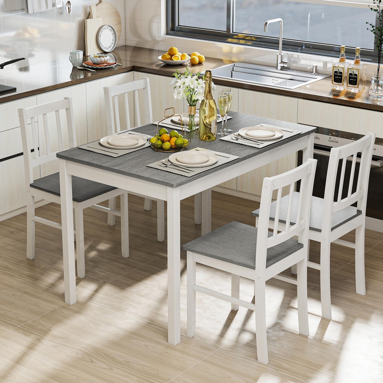 Buytime 5-Piece Dining Table Set for 4, Solid Wood Farmhouse Rectangular Kitchen Table Set with 4 Chairs, Space-Saving Wooden Dinette Set for Small Space, Dining Room, Breakfast Nook, Grey & White