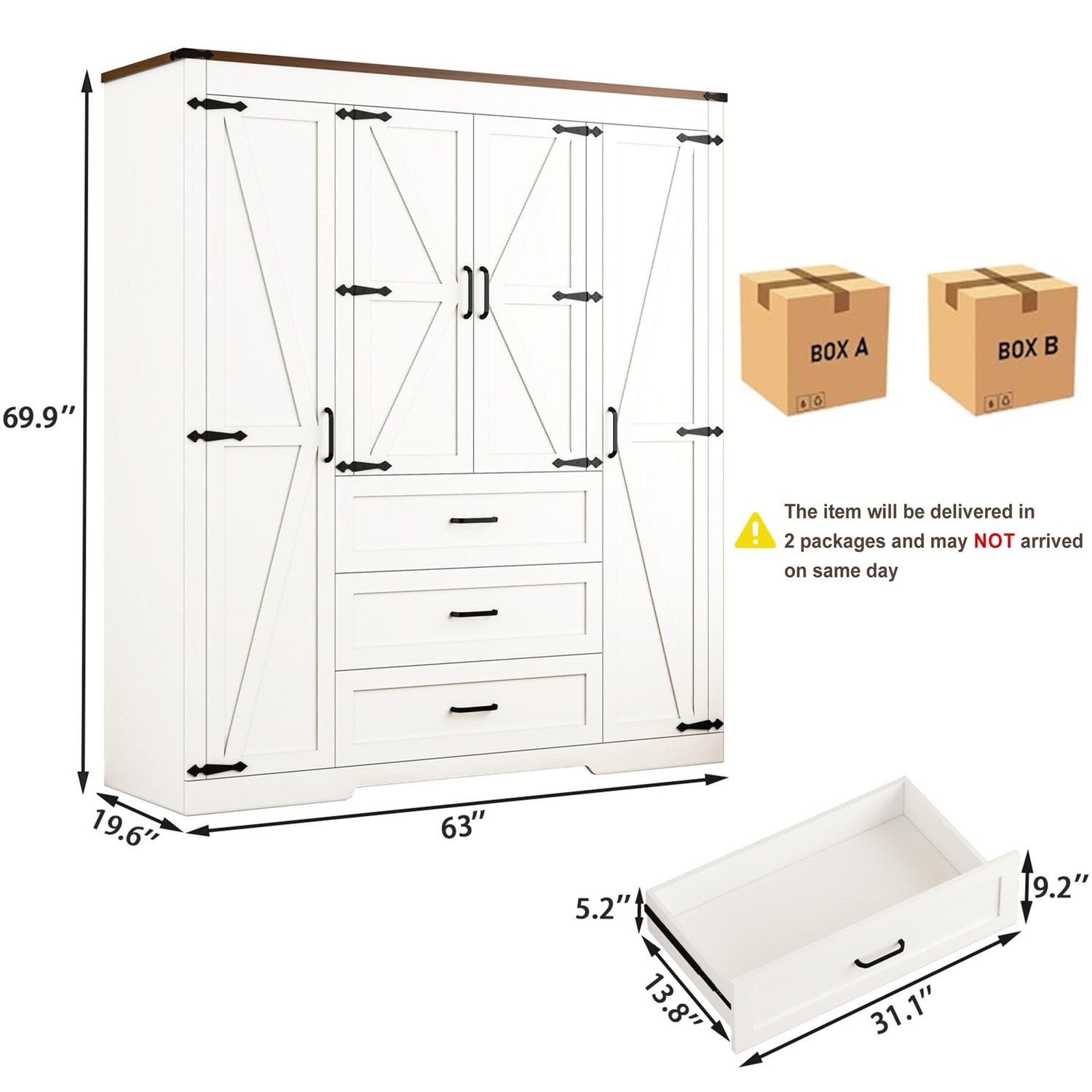 CayugaCrekrd 70" Tall Armoire Wardrobe Closet with 4 Doors & 3 Drawers, Farmhouse Bedroom Storage Cabinet with Hanging Rod, Freestanding Wooden Armoire Wardrobe Closet, White