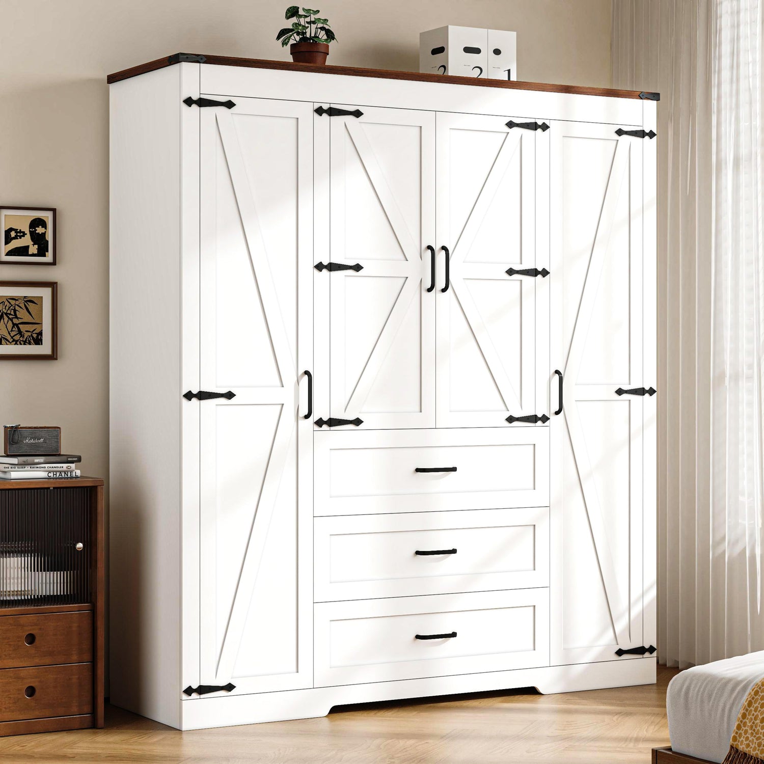 FARMHOUSE CHARM WITH BARNDOOR DESIGN: The wooden armoire showcases authentic barn door hardware and a distressed white finish, adding a cozy, rustic touch to modern or farmhouse-themed bedrooms.