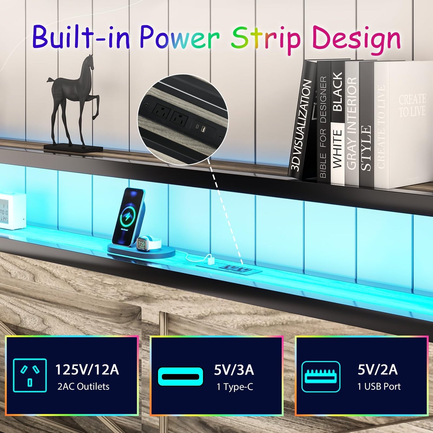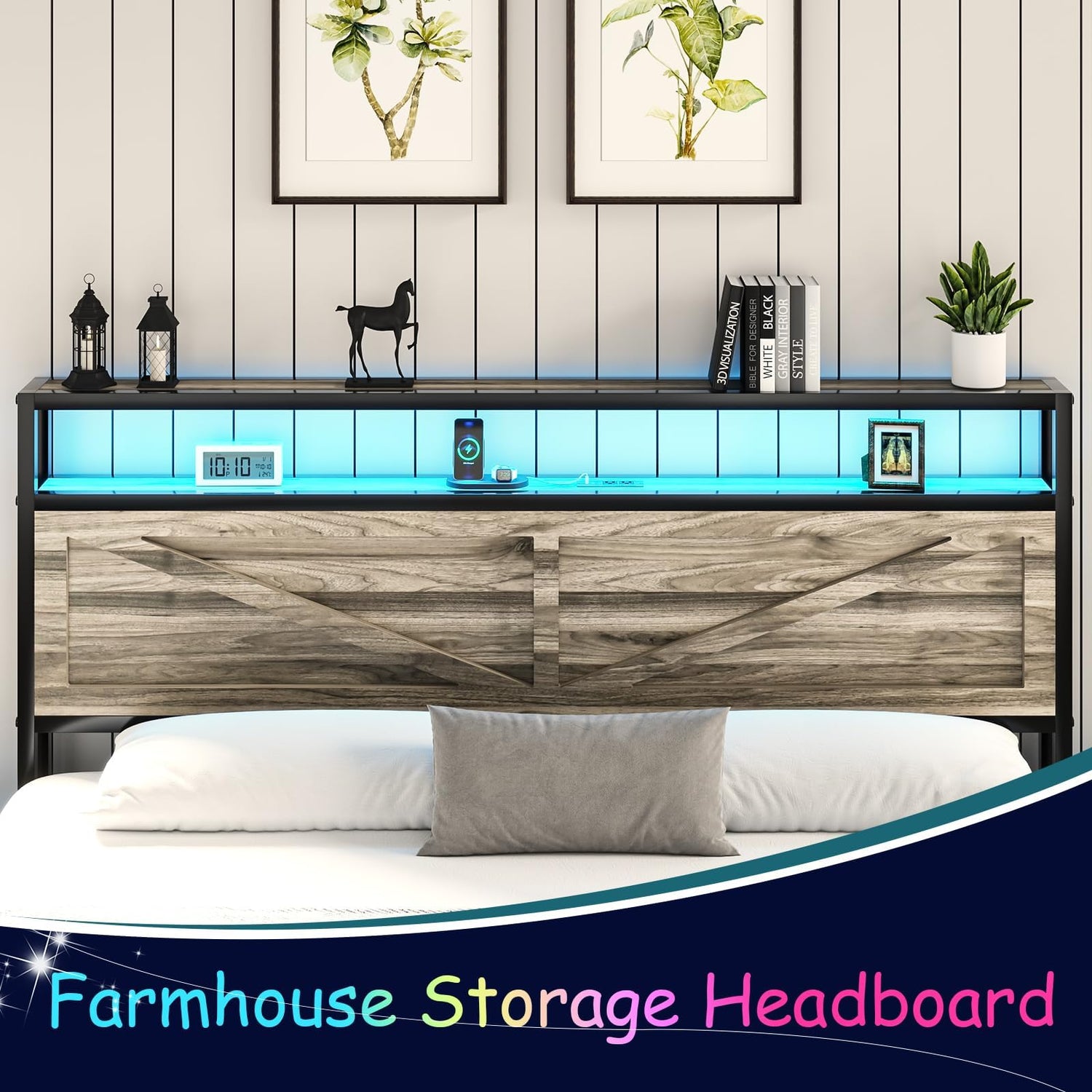 CHABUILDREARK Twin Bed Frame with Charging Station and LED Lights, Metal Platform Bed with Wood Storage Headboard, Rustic Barn Door Design, Noise Free, No Box Spring Needed, Wash Grey