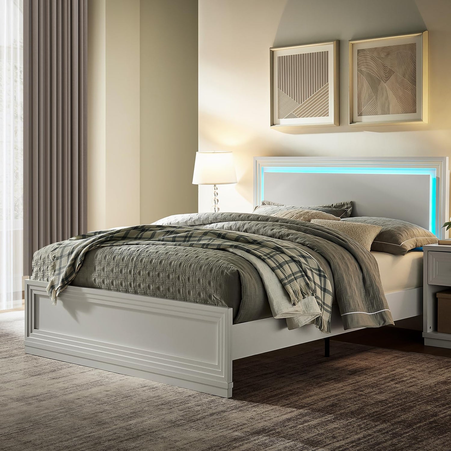 Cherytika Queen Wood Bed Frame with Headboard and Footboard, Farmhouse Queen Bed with RGB LED Light, Wood Slats Support, Noise-Free, Sturdy Structure, Easy Assembly, White
